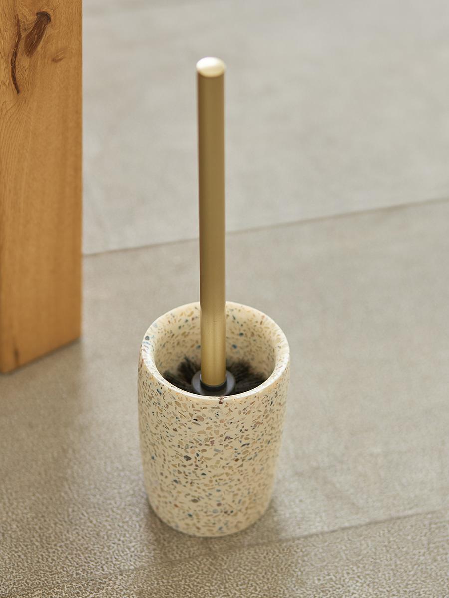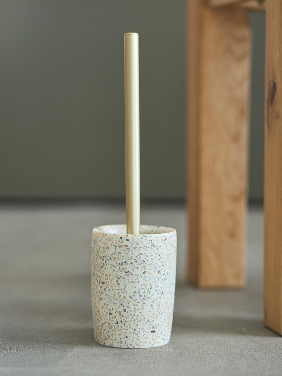 Ершик для унитаза Mosaic – стильное и функциональное решение для современного санузла. Фактура натурального камня и нейтральная цветовая гамма делают аксессуар практичным и позволяют вписать его в различные варианты оформления интерьера. Особенности и преимущества: - Стакан выполнен из композитного материала, который обладает высокой прочностью, устойчив к воздействию влаги. - Ручка ершика из прочной нержавеющей стали имеет оптимальную длину для комфортного использования. - Ворс из полипропилена не впитывает влагу и неприятные запахи, не накапливает бактерии, легко очищается. - Дизайн с имитацией каменной фактуры актуален как для современных, так и классических интерьеров. Материалы: терраццо, полирезин, нержавеющая сталь, полипропилен. Размеры: 9,6х9,6х35 см. Цвет: светло-бежевый. Можно очищать в теплой воде с помощью мягких моющих средств. Запрещается использование агрессивной бытовой химии и абразивных материалов.