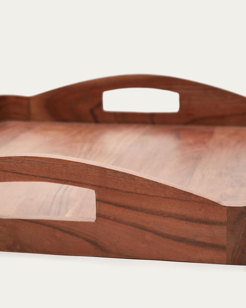 Поднос Elissa от фабрики La Forma (ex Julia Grup) – уникальная деталь для вашей сервировки Поднос Elissa изготовлен из цельного дерева. А значит, он абсолютно эксклюзивен, так как имеет свою текстуру и оттенки. В нем отлично будут смотреться бутерброды, хлеб или даже фрукты. А удобные ручки делают этот поднос удобным в использовании. Поднос прямоугольной формы с бортиками по всему контуру и ручками для удобного переноса. Он сделан из древесины акации в натуральной отделке. Сверху полиуретановое прозрачное покрытие, которое защищает массив от негативного воздействия влаги и солнца. Толщина стенок около 1 см, что обеспечивает прочность и надежность изделия. Углы подноса скруглены. Изделие запрещено мыть в посудомоечной машине. Только ручное мытье без отбеливания и абразивов. В коллекции подносы представлены разных размеров и конструкций (с ножками или без). Поэтому вес и габариты у изделий разные: ширина – 54/36 см, высота – 8/8 см, глубина – 45/30 см Вес изделия: 1,8/1 кг. Подносы подойдут для сервировки стола на открытых территориях, но под навесом.