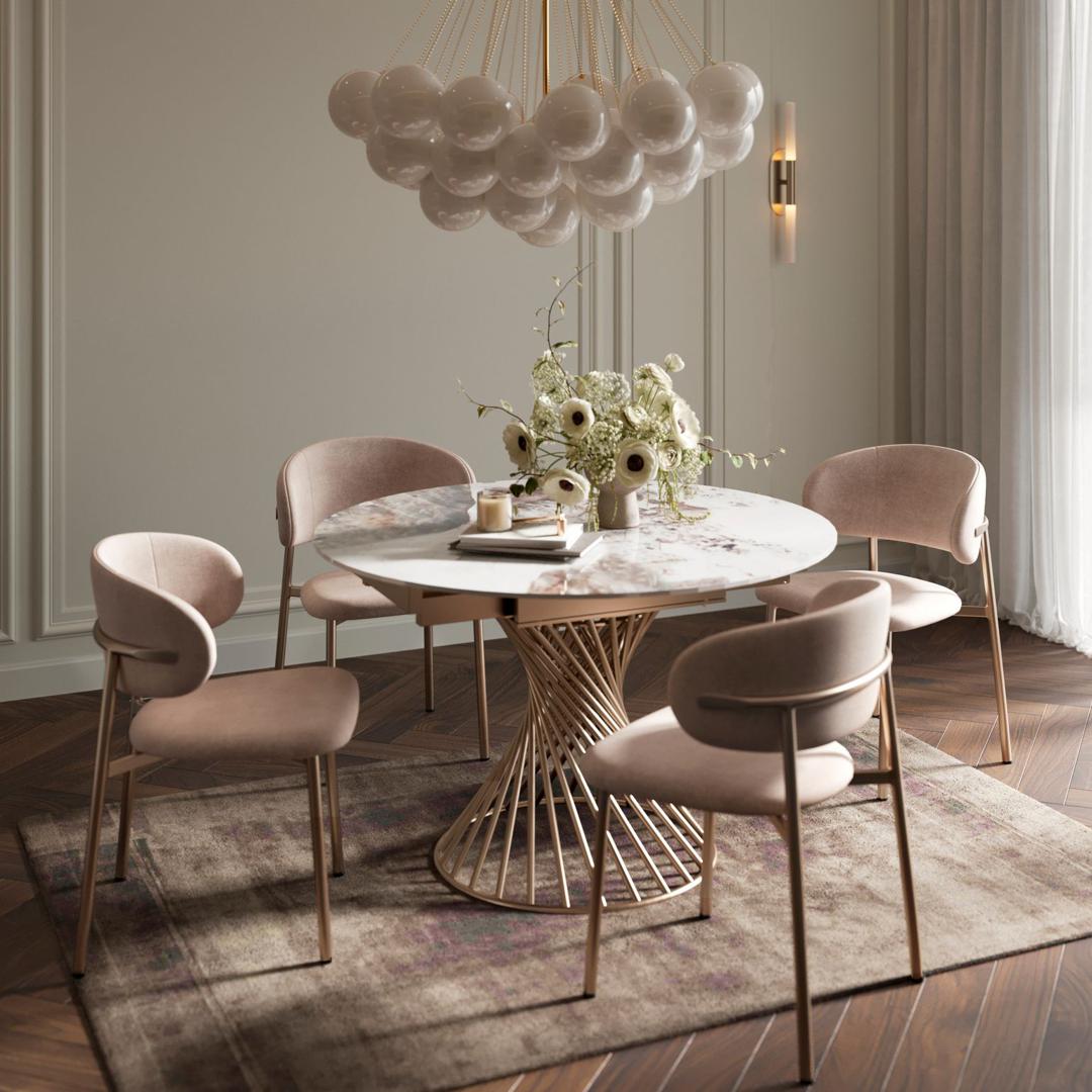 Дизайн стола «Лава» строится на двух сильных приемах: основание из витых металлических прутьев и уникальная форма трансформации. При раскладывании полукруглые секции образуют нестандартную круглую столешницу с волнообразным краем, превращая стол в скульптуру. Это готовое концептуальное решение для тех, кто ищет в интерьере не просто функциональность, но и характер. Широкая палитра оттенков керамики позволяет вписать этот дизайнерский жест в любую эстетику — от лаконичного минимализма до насыщенной классики. «Лава» создан для того, чтобы быть центром притяжения и местом, где рождаются самые важные моменты. h3Столешница/h3 Бронированная керамика толщиной 12 мм в глянцевом исполнении Top Pandora — это гармония передовой технологии и природной эстетики. Специальное покрытие раскрывает всю глубину и сложность рисунка, даря поверхности сходство с благородным полированным камнем. При этом материал обладает премиальной устойчивостью к влаге, истиранию и бытовым пятнам, что делает уход минимальным, а срок службы — максимальным. h3Механизм трансформации/h3 Инновационный механизм стола «Лава» делает его трансформацию интуитивно понятной и простой. Две дополнительные полукруглые секции плавно выдвигаются по специальным направляющим, добавляя по 30 см с каждой стороны и увеличивая полезную площадь на 60 см. В разложенном виде стол создаёт комфортную зону для 8 человек. При этом он сохраняет исключительную устойчивость: основная часть рассчитана на 50 кг, а каждая из полукруглых секций — на 15 кг распределённого веса, что позволяет с уверенностью сервировать его для праздничного ужина. h3Опора и каркас/h3 Дизайнерская опора в форме спиралевидных металлических прутьев служит главным акцентом стола. Она сочетает визуальную лёгкость с конструктивной прочностью. Изысканный оттенок каркаса и опор «шампань» визуально облегчает конструкцию и добавляет пространству тепла и света. Износостойкая порошковая окраска защищает цвет от выцветания. h3Уход и гарантия/h3 Чтобы керамическое покрытие оставалось безупречным, мы рекомендуем использовать подставки под горячее. Для очистки достаточно мягкой влажной ткани. Мы уверены в качестве нашего стола и подтверждаем это гарантией 18 месяцев с момента покупки. h3Индивидуальная комплектация/h3 span class="strong-text"Столешница:/span Глянцевая или матовая бронированная керамика 12 мм. Палитра включает 9 цветов с различной текстурой.br/ span class="strong-text"Опора:/span На выбор — чёрный муар, серый муар, белый муар, шампань/золото. Подберите идеальную комбинацию для вашего проекта. Все детали для персонального заказа уточняйте у менеджера.