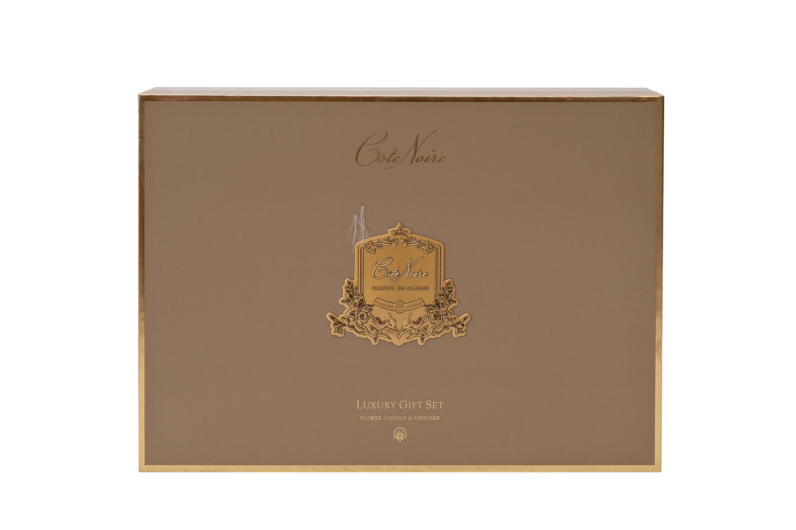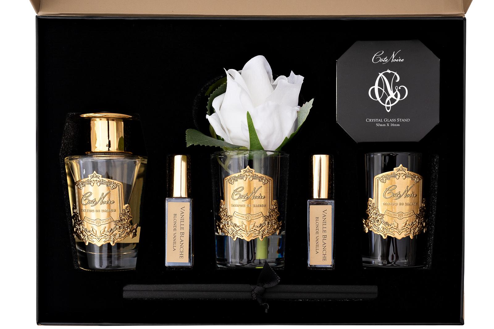 description-full - Восхитительные французские ароматы для дома в стиле ар-деко: набор из искусственной белой розы в стеклянной вазе-стакане, заполненной прозрачным гелем, ароматического спрея Светлая Ваниль (Blonde vanilla), аромадиффузора с палочками и аромасвечи в стеклянном стакане с крышкой. Все предметы упакованы в красивую подарочную коробку. Бутон розы выполнен настолько реалистично, что кажется, он только что сорван, аромадиффузор с палочками и свеча дополняют подарочную композицию и насыщены парфюмированным ароматом. Светлая Ваниль - верхние ноты жасмина, средние ноты кокоса, базовые ноты кедра и ванили наполнят атмосферу потрясающим ванильным ароматом. Распыляйте спрей на розу по мере необходимости -необыкновенное благоухание распространится по комнате. Используйте также аромасвечу и аромадиффузор с палочками. Наполните свой дом ароматами, меняя и комбинируя их, создавая в нем свою неповторимую атмосферу. Набор отлично подойдет в качестве эффектного и эксклюзивного подарка.