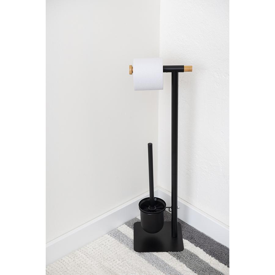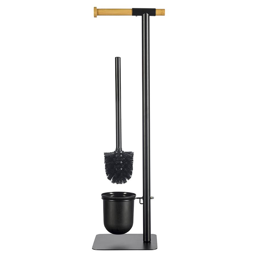 Держатель для туалетной бумаги с ершиком Mats от бренда Bergenson Bjorn представляет собой стильную и продуманную до мелочей конструкцию, которая прекрасно впишется в интерьер любого современного санузла. Сочетание элементов из железа и бамбука обеспечивает напольному аксессуару практичность, долговечность и интересный вид. Щетка с изогнутой рукояткой удобно сидит в руке и позволяет качественно очищать унитаз в труднодоступных местах. Внутренний контейнер из пластика защищает металлический корпус от прямого контакта с водой и загрязнениями, легко моется. За счет минималистичного дизайна и классического цветового решения модель отлично сочетается с различными вариантами оформления помещения. Материал: железо, бамбук. Размеры: 20,5х18х67 см. Цвет: черный. Пыль и загрязнения рекомендуется удалять при помощи мягкого влажного материала.