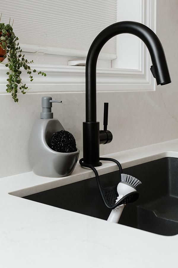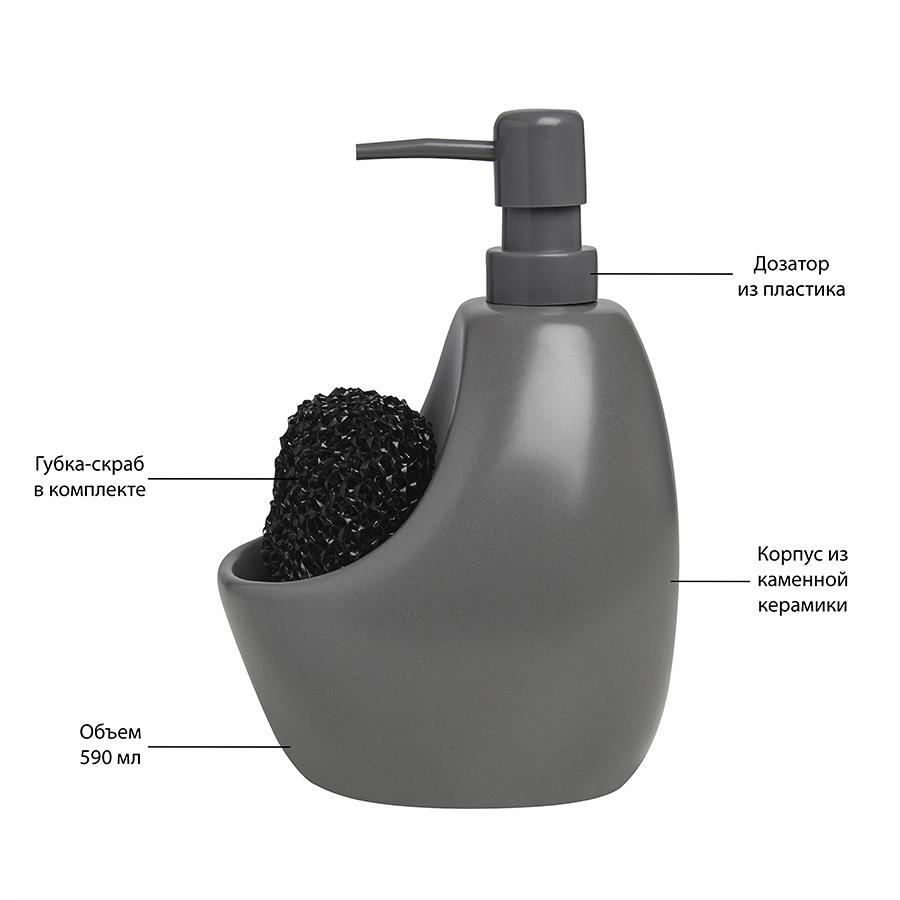 Диспенсер Joey поможет навести порядок в зоне раковины и облегчит процесс мытья посуды. Выполненный из керамики, он не только практичный и долговечный, но и стильно смотрится в интерьере. Объем 590 мл обеспечивает длительное использование без необходимости дозаправки. Моющее средство дозируется экономно через удобный длинный носик. В конструкции предусмотрено отделение для губки, которая входит в комплект. Материалы: керамика, ABS-пластик, полипропилен. Размеры: 10х13х20 см. Объем: 590 мл. Цвет: уголь. Дизайнер: Sativa Turner. Можно мыть в теплой мыльной воде с помощью мягкой губки. Запрещается использование абразивов и агрессивной бытовой химии.