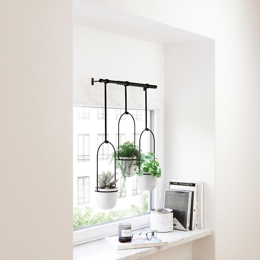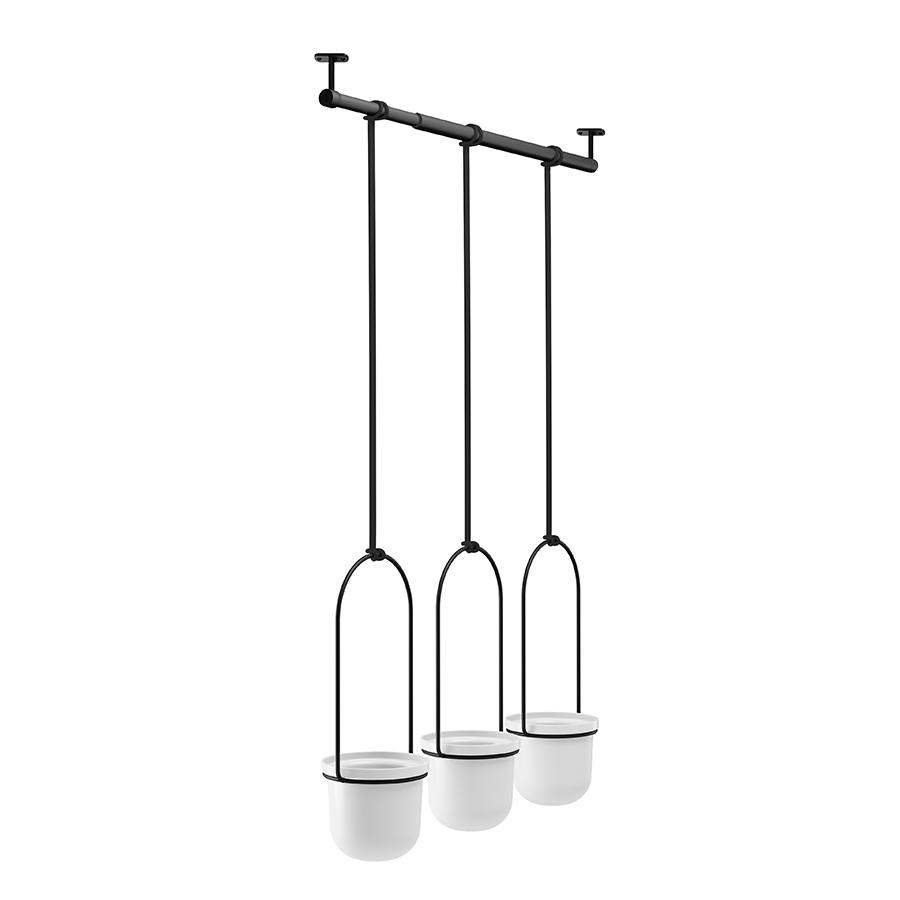 Подвесные горшки Triflora от Umbra станут оригинальным украшением на стене или окне, а также позволят компактно разместить сразу несколько растений и обеспечат их удобный полив. Изготовленные из прочного формованного полипропилена, полученного из вторичной переработки, они остаются легким даже с комнатной зеленью внутри. Дизайнеры создали планку подвесного типа, чтобы освободить место на подоконнике и предметах мебели. Прочные веревки из хлопка надежно удерживают горшки и для максимального удобства могут регулироваться по горизонтали и вертикали. Держатель легко монтируется за счет крепежных элементов, которые входят в комплект. Материалы: полипропилен, сталь. Размеры конструкции: 63х106 см. Дизайн: Chris Snell, Dayna Mailach. Цвет: белый. Пыль и загрязнения можно удалять при помощи мягкого влажного материала.