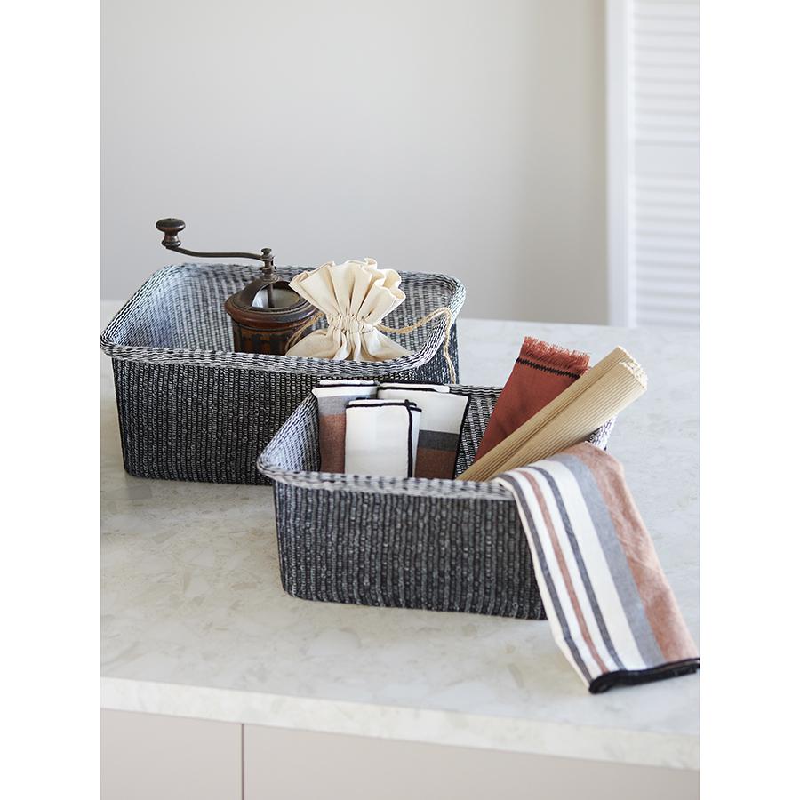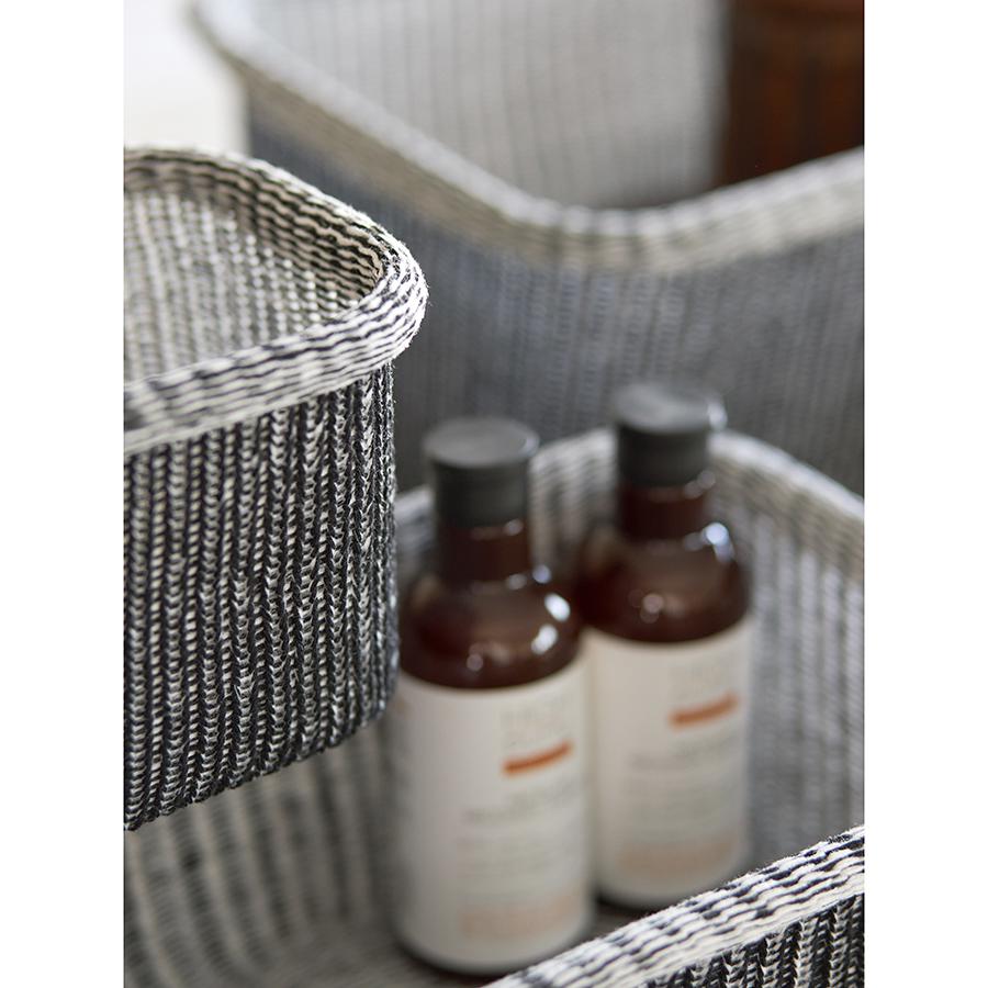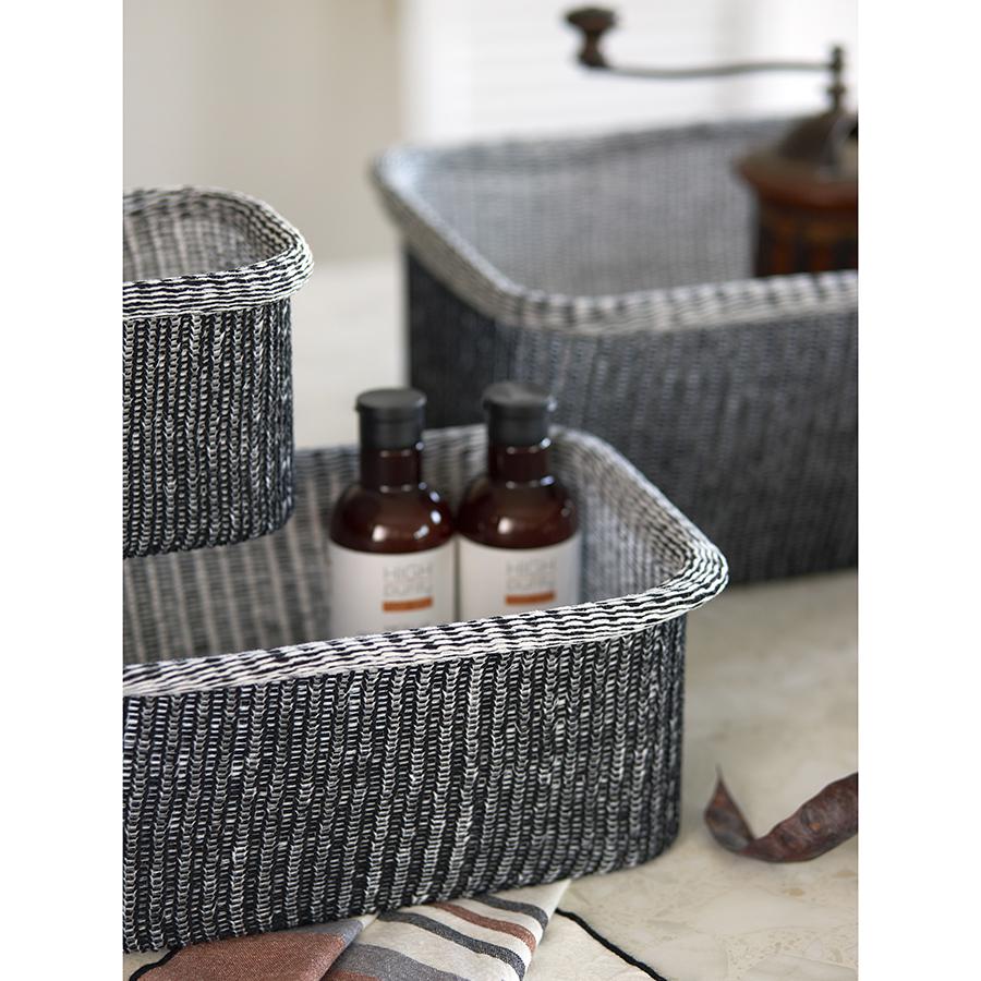 Корзины для хранения Sustainable collection сочетают в себе трендовый дизайн в эко-стиле и высокую практичность, что делает их идеальным выбором для организации пространства вашего дома. Они могут стать акцентным элементом интерьера, использоваться в шкафу и любой из комнат для хранения белья, детских игрушек и любых других вещей. Особенности и преимущества: - Изделия выполнены из биоразлагаемых материалов, согласно стандарту GRS, – приобретая их, вы проявляете заботу об экологии. - Благодаря тугому плетению корзины прочные, при этом легкие и хорошо держат форму. - Компактные, при этом вместительные – для удобного хранения их можно штабелировать. - Текстильные аксессуары с вязаной фактурой идеально вписываются в интерьер в стиле эко, кантри, прованс или рустик. Как разгладить заломы на текстильной корзине: 1. Достаньте корзину из транспортной упаковки. 2. Расправьте ее и распрямите заломы вручную, насколько это возможно. 3. Плотно заполните корзину подушками или любыми мягкими материалами. 4. Через несколько дней она вернется к изначальному виду. 5. Для устранения заломов вы также можете использовать отпариватель. Материалы: полиэстер, хлопок, железо. Размеры корзин: 30х42х19,5 см; 27х37х18,5 см; 22х32х17 см; 17х22,5х13,5 см. Цвет: черный. Количество в наборе: 4 шт. Максимальная нагрузка: 17 кг, 13 кг, 8 кг, 3,5 кг. Допускается ручная чистка мягкой губкой.