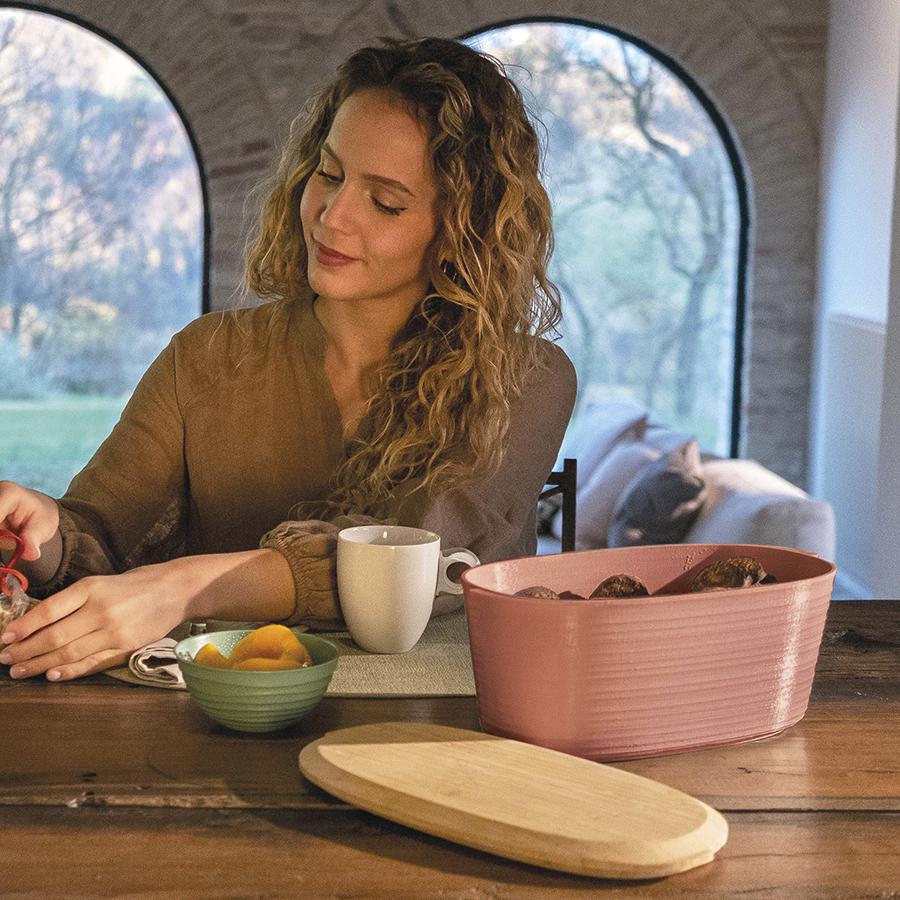Хлебница из переработанного пластика с бамбуковой крышкой Tierra спасет выпечку от высыхания и украсит пространство кухни. Ее также можно использовать в качестве оригинального органайзера. Изделие выполнено из переработанных пластиковых бутылок из-под воды. Материалы: переработанный пластик, бамбук. Размеры: 31,5х16,4х12,9 см. Объем: 3 л. Цвет: терракотовый. Пластиковый корпус можно мыть в посудомоечной машине. Крышку рекомендуется протирать влажной губкой.