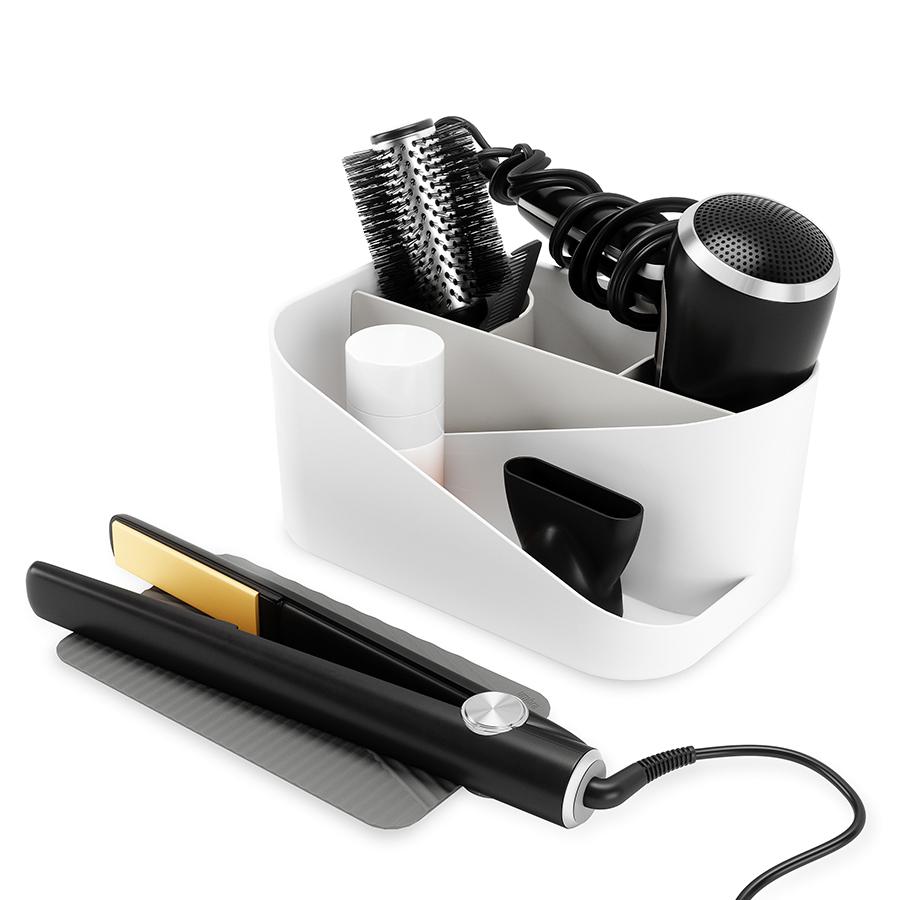 Стильный бьюти-органайзер позаботится о сохранности косметики и аксессуаров для волос. Несколько отделений позволяют организованно размещать предметы разных размеров. В набор входит силиконовый термостойкий коврик для горячих плоек и утюжков. Компактный органайзер не занимает много места в ванной или на туалетном столике. Материал: переработанный полипропилен, силикон, полистирол. Размеры: 17х27х13 см.