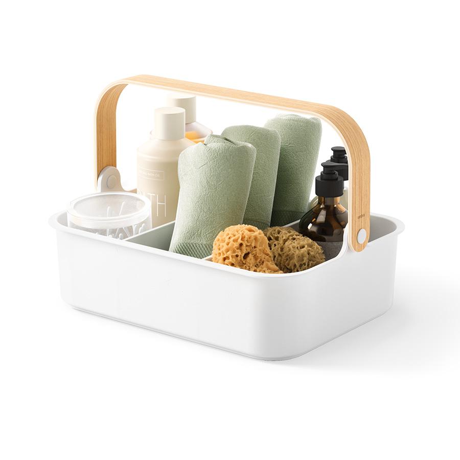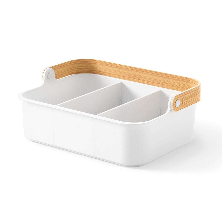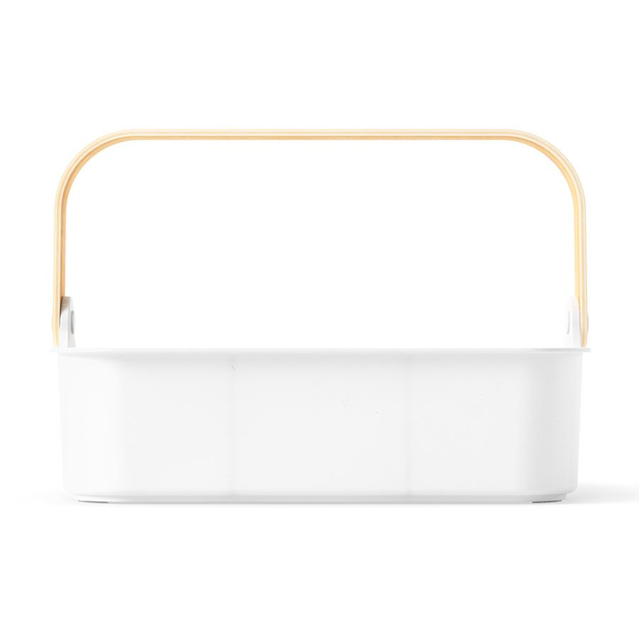 Органайзер Bellwood поможет организовать компактное хранение продуктов и вещей в любой из комнат. Специальные разделители позволяют удобно размещать и сортировать предметы. Органайзер на 80% выполнен из переработанного АБС-пластика, известного своей прочностью, устойчивостью к износу и долговечностью. Он оснащен ручкой из древесины, которая обеспечивает простую переноску, а также делает дизайн привлекательным и интересным. Материалы: переработанный АБС-пластик, тополь, ясень, нейлон, силикон. Размеры: 37х27х25 см. Цвет: белый/натуральное дерево. Пыль и загрязнения с поверхностей можно удалять при помощи мягкого влажного материала. Запрещается использование абразивов и агрессивной бытовой химии.