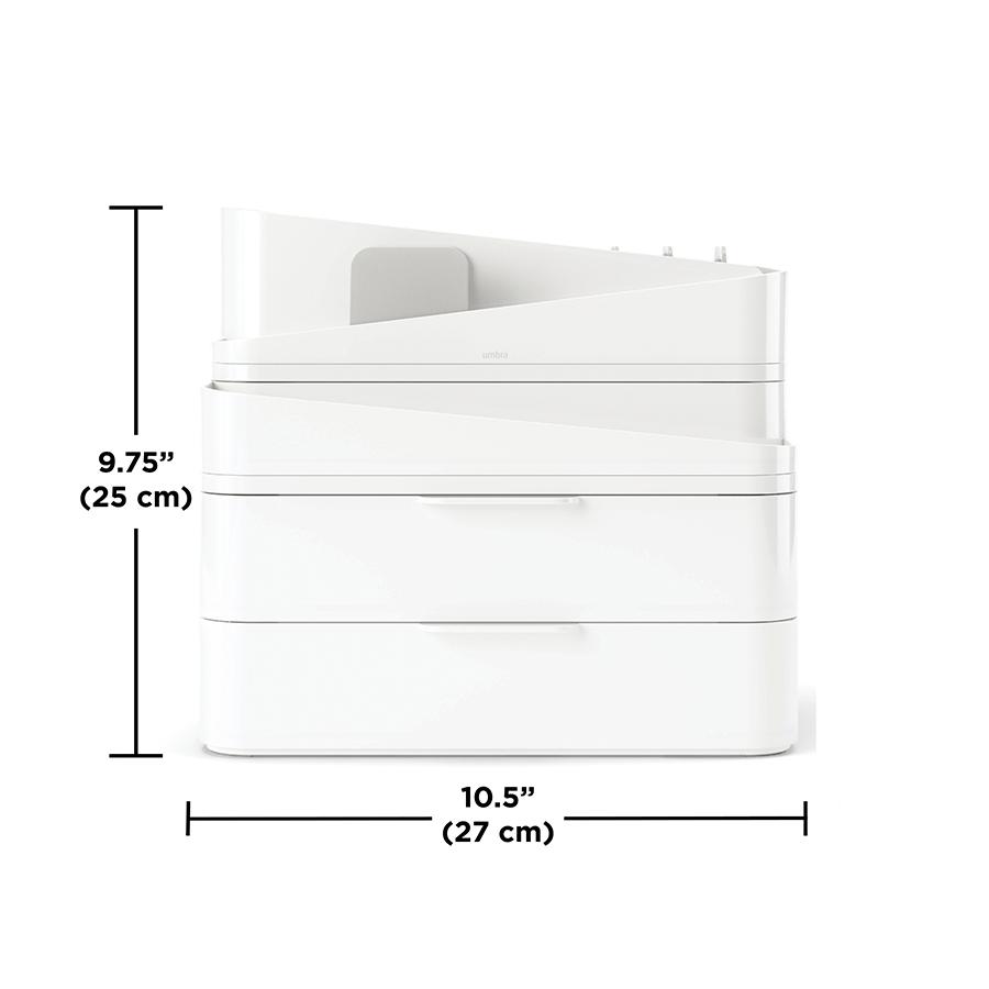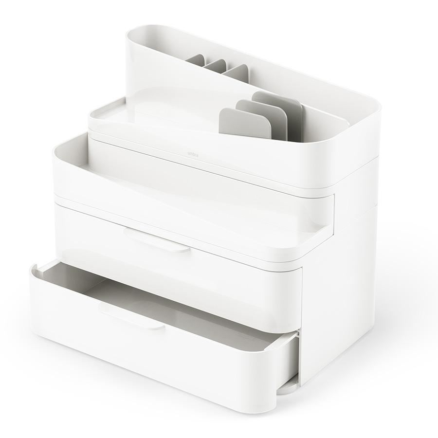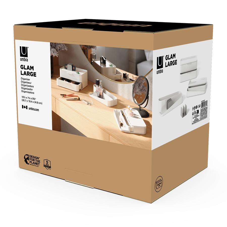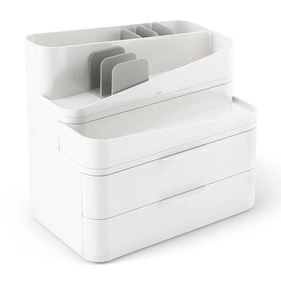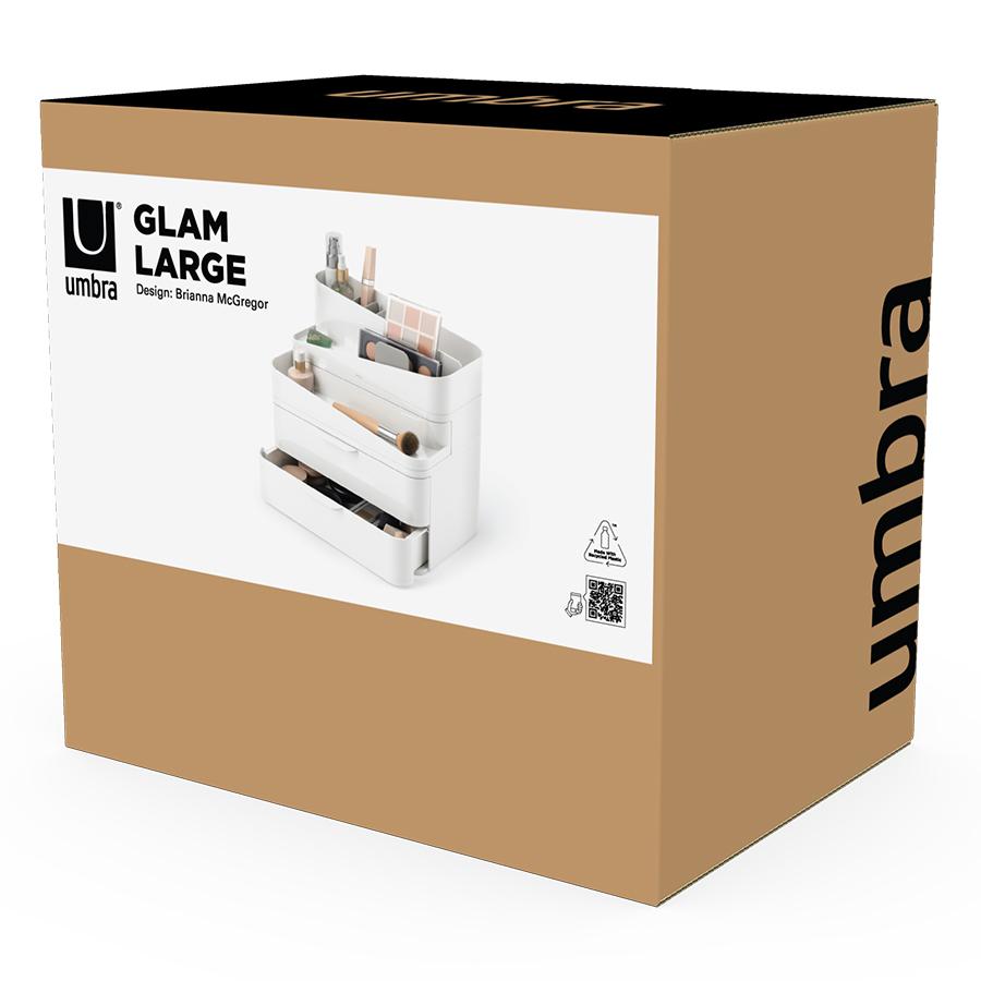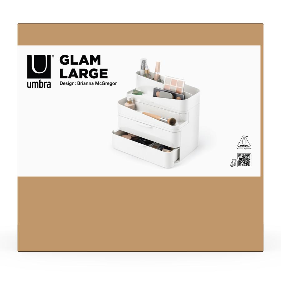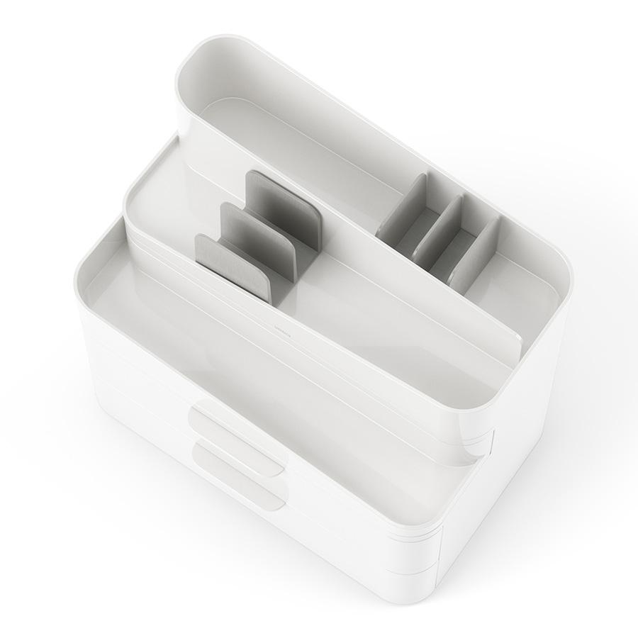 Органайзер-косметичка Glam поможет быстро навести порядок на вашем туалетном столике. Конструкция с тремя ящиками и отделениями для открытого хранения является очень вместительной и удобной в использовании. Съемные разделители позволяют создавать идеальные условия для хранения таких предметов, как кисти для макияжа, палетки теней и многое другое. Благодаря резиновым ножкам органайзер надежно фиксируется на столешнице, не повреждая ее поверхность. Материал: переработанный ABS-пластик. Размеры: 27х25 см. Цвет: белый/серый. Пыль и загрязнения с поверхностей можно удалять при помощи мягкого влажного материала. Запрещается использование абразивов и агрессивной бытовой химии.