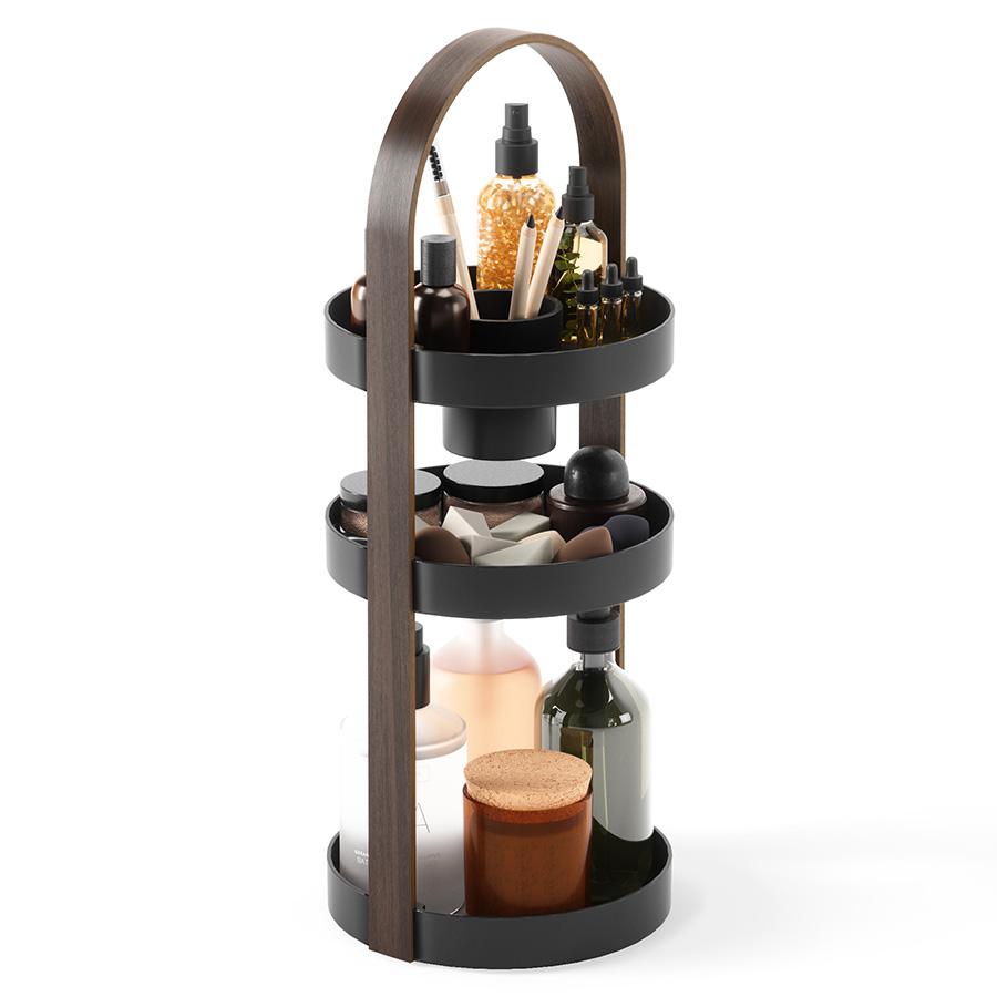 Органайзер Bellwood представляет собой вместительную трехуровневую конструкцию с ручкой для удобной переноски. Благодаря компактности и минималистичному дизайну такой аксессуар великолепно смотрится на туалетном столике, а также в интерьере ванной комнаты. Вы можете использовать лотки для хранения косметики, уходовых средств, полотенец и многого другого. Съемная чаша, расположенная по центру, идеально подходит для размещения кистей для макияжа и различных инструментов. Органайзер на 60% выполнен из переработанного АБС-пластика, известного своей прочностью, устойчивостью к износу и долговечностью. Элементы из натуральной древесины тополя привносят в дизайн природное очарование. Материалы: переработанный АБС-пластик, тополь, ясень, сталь, резина. Размеры: 20х20х50 см. Цвет: черный/орех. Пыль и загрязнения с поверхностей можно удалять при помощи мягкого влажного материала. Запрещается использование абразивов и агрессивной бытовой химии.
