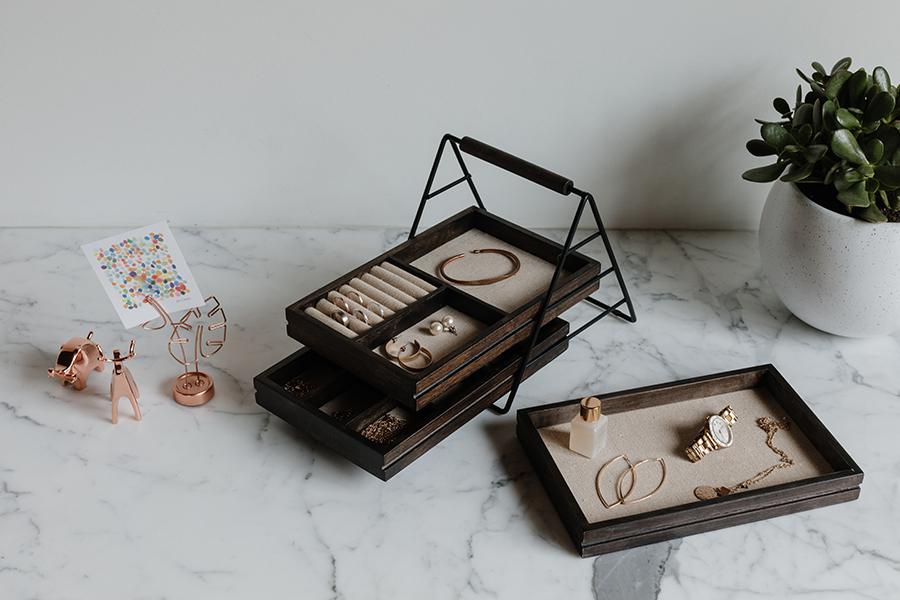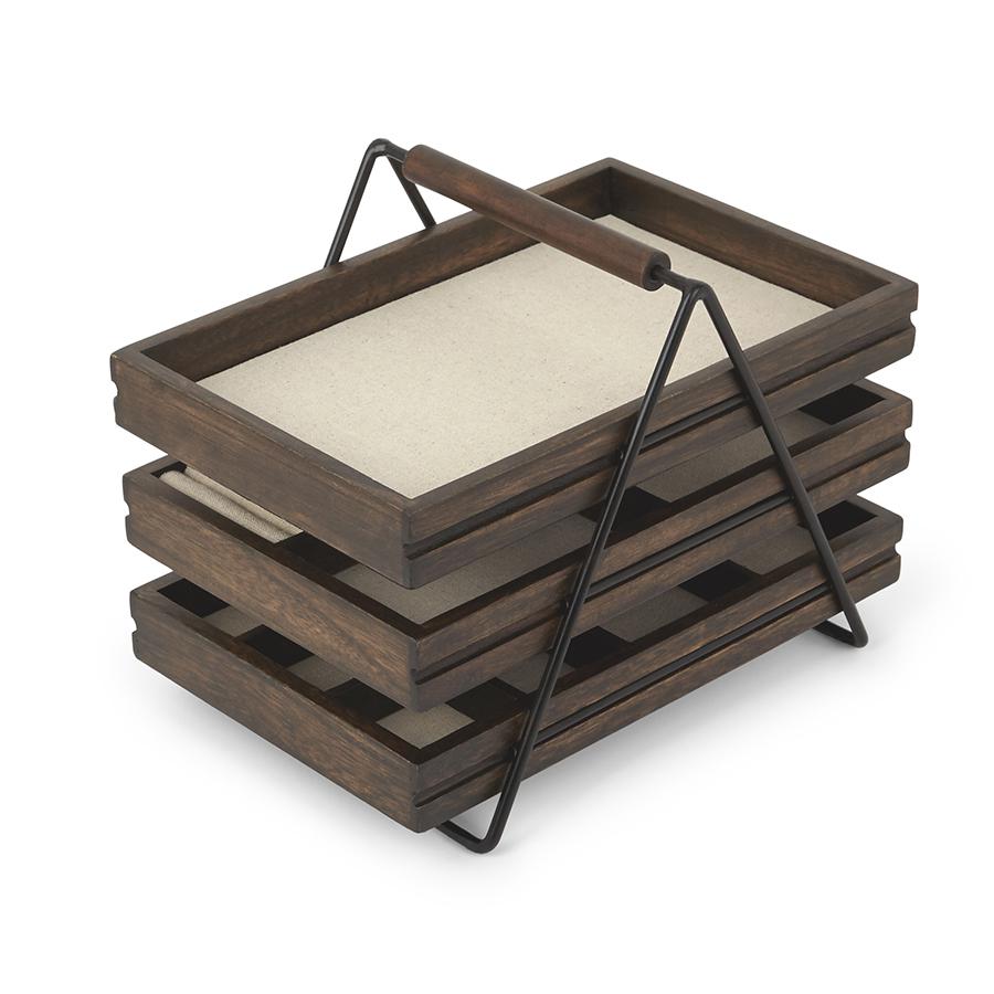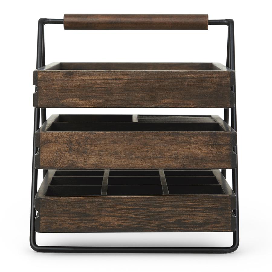 Деревянная многоярусная шкатулка позаботится о ваших украшениях. Благородное сочетание натурального темного дерева и металла с черным матовым покрытием делает шкатулку отличным подарком как для женщины, так и для мужчины. Три отделения раздвигаются друг относительно друга, благодаря чему все содержимое шкатулки будет перед глазами. Внутренняя часть покрыта льном. В шкатулке есть подушечки для хранения колец или запонок, маленькие секции для сережек и брошей, а также большое отделение для браслетов, цепочек и ожерелий. Материал: каучуковое дерево, сталь, лен. Размеры: 25х18х20 см. Цвет: черный/орех. Пыль и загрязнения удалять при помощи мягкой салфетки. Запрещается использование агрессивной бытовой химии и абразивных материалов.