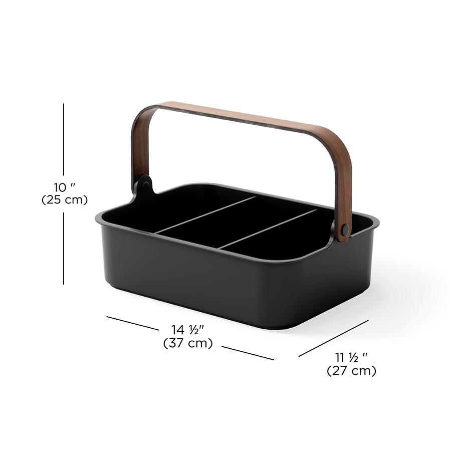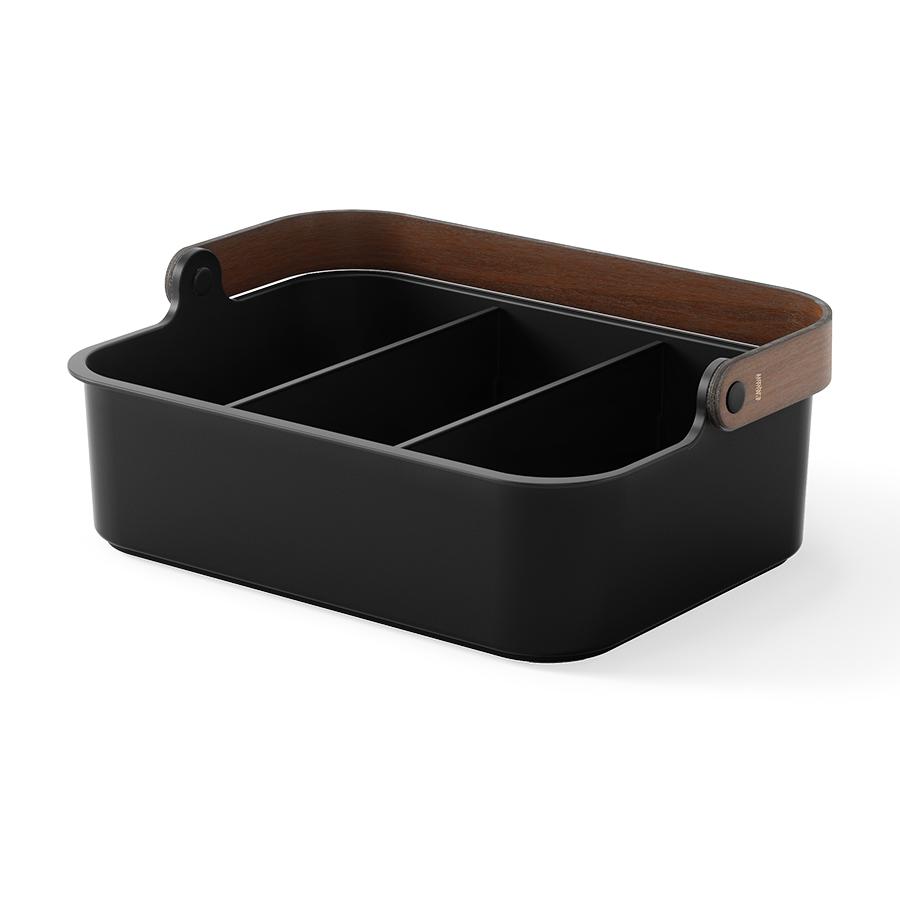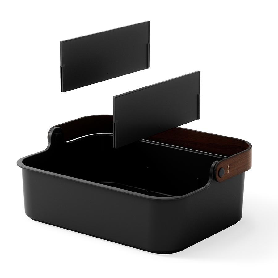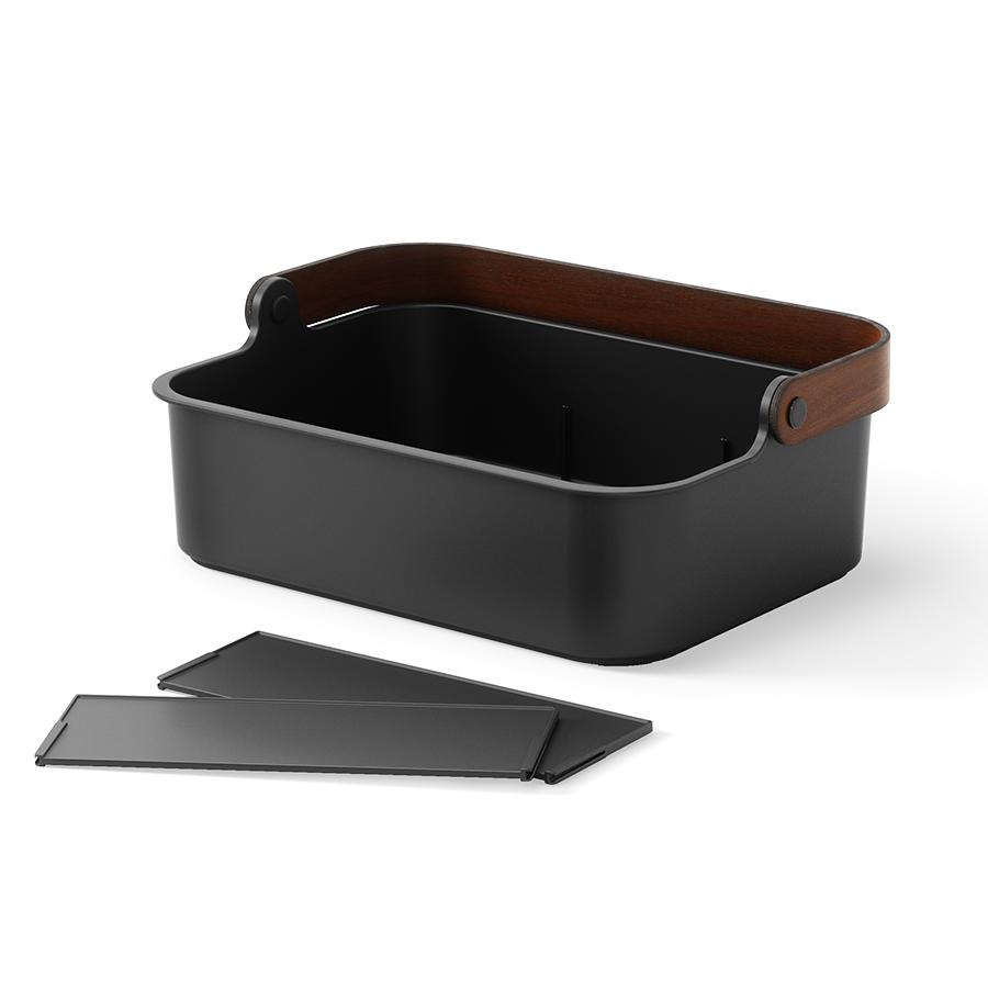 Органайзер Bellwood поможет организовать компактное хранение продуктов и вещей в любой из комнат. Специальные разделители позволяют удобно размещать и сортировать предметы. Органайзер на 80% выполнен из переработанного АБС-пластика, известного своей прочностью, устойчивостью к износу и долговечностью. Он оснащен ручкой из древесины, которая обеспечивает простую переноску, а также делает дизайн привлекательным и интересным. Материалы: переработанный АБС-пластик, тополь, ясень, нейлон, силикон. Размеры: 37х27х25 см. Цвет: черный/орех. Пыль и загрязнения с поверхностей можно удалять при помощи мягкого влажного материала. Запрещается использование абразивов и агрессивной бытовой химии.