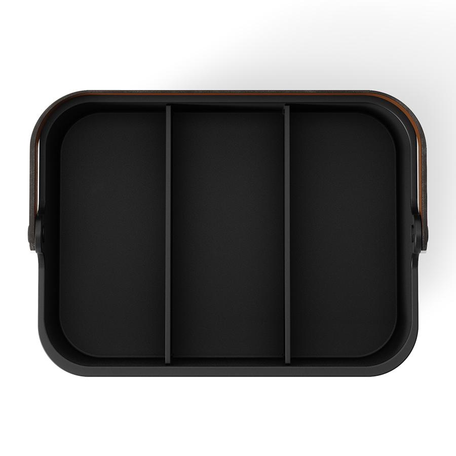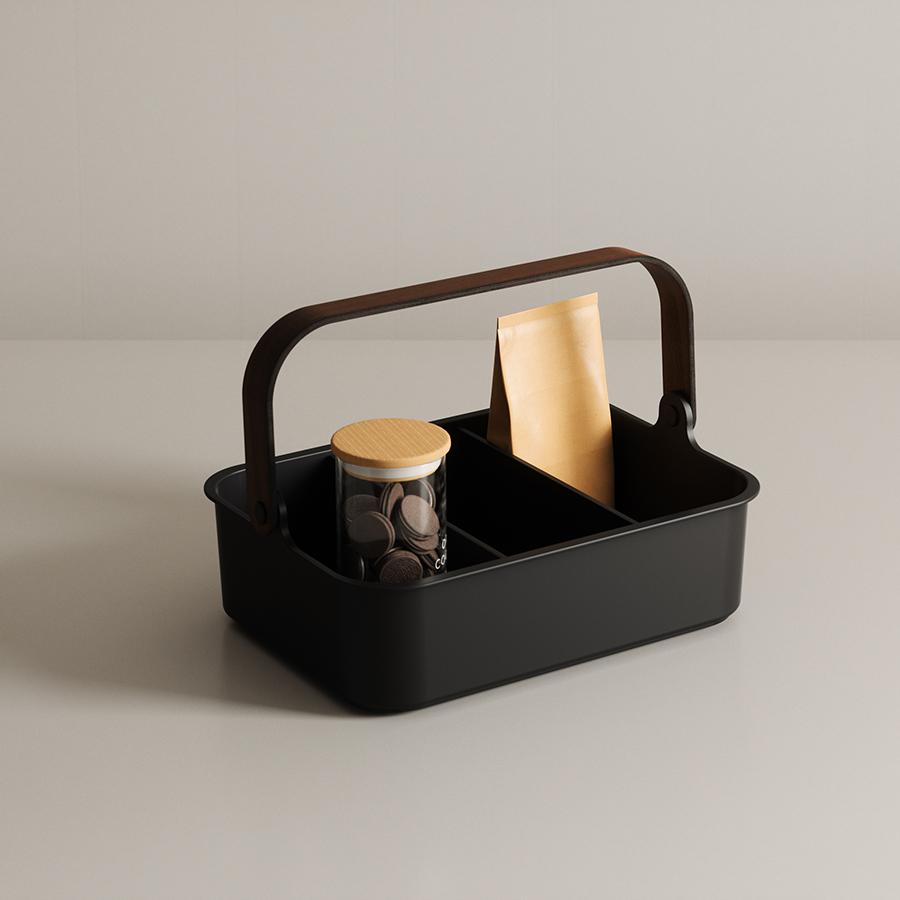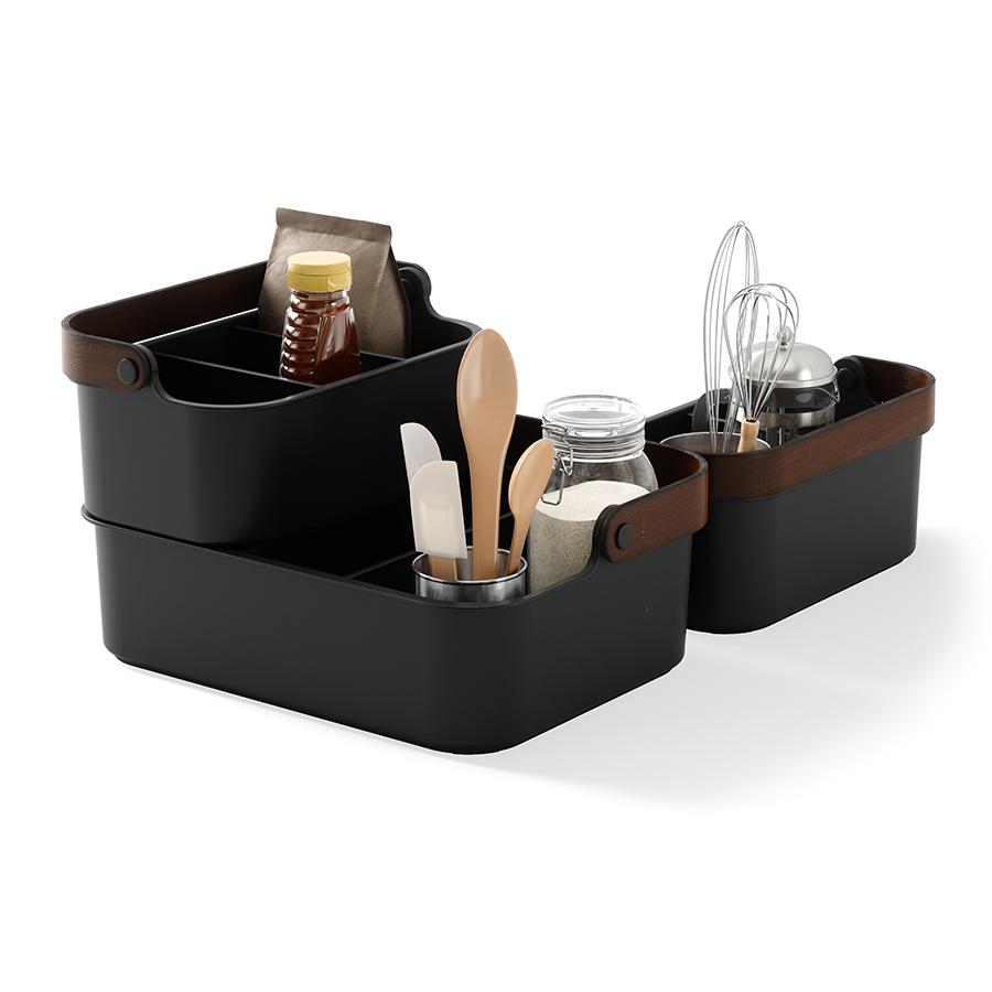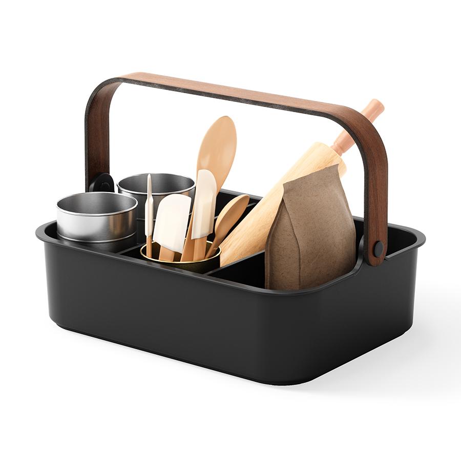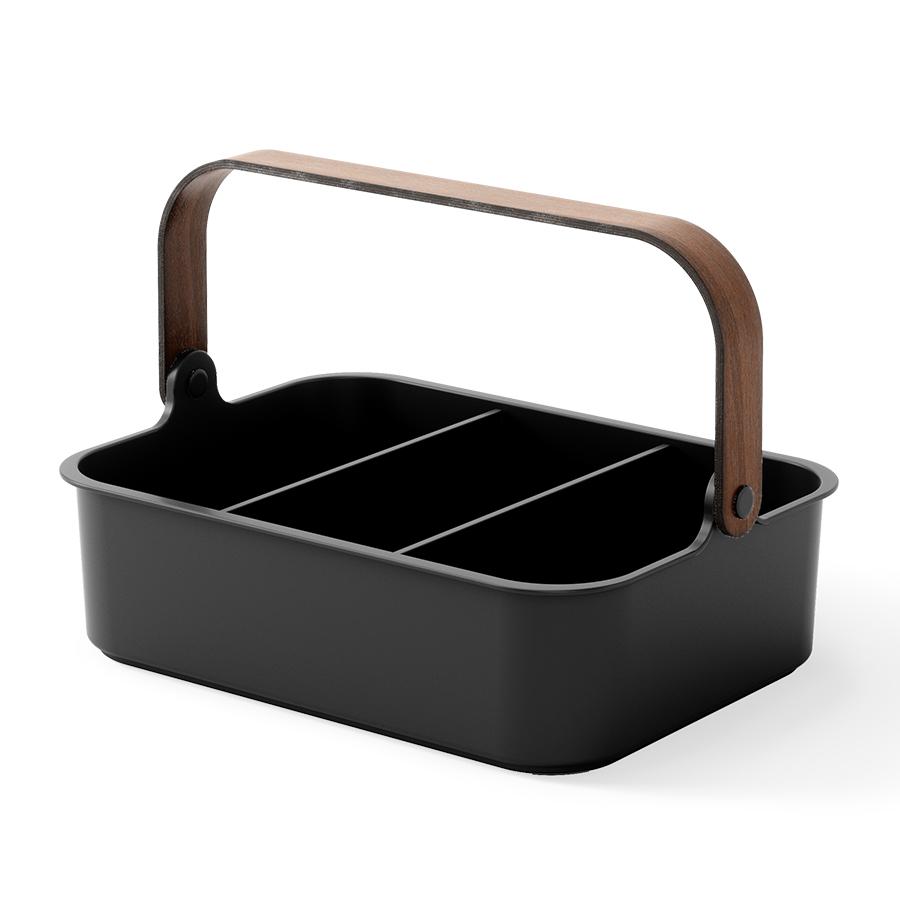 Органайзер Bellwood поможет организовать компактное хранение продуктов и вещей в любой из комнат. Специальные разделители позволяют удобно размещать и сортировать предметы. Органайзер на 80% выполнен из переработанного АБС-пластика, известного своей прочностью, устойчивостью к износу и долговечностью. Он оснащен ручкой из древесины, которая обеспечивает простую переноску, а также делает дизайн привлекательным и интересным. Материалы: переработанный АБС-пластик, тополь, ясень, нейлон, силикон. Размеры: 37х27х25 см. Цвет: черный/орех. Пыль и загрязнения с поверхностей можно удалять при помощи мягкого влажного материала. Запрещается использование абразивов и агрессивной бытовой химии.