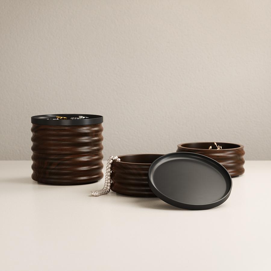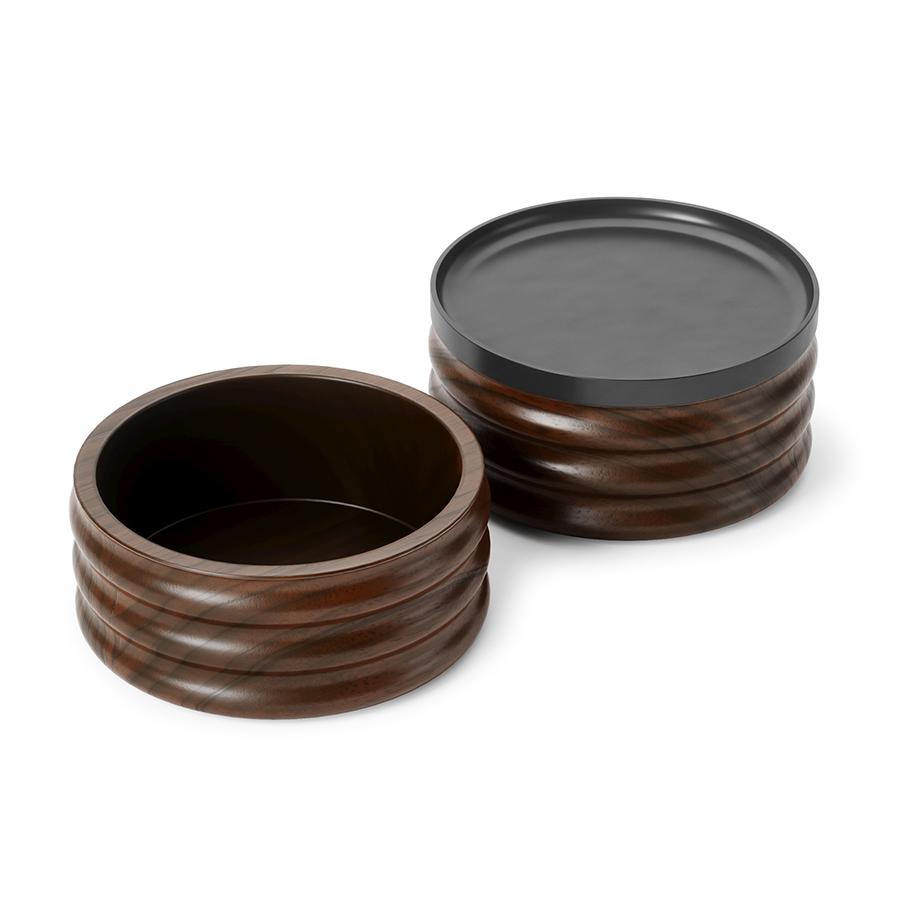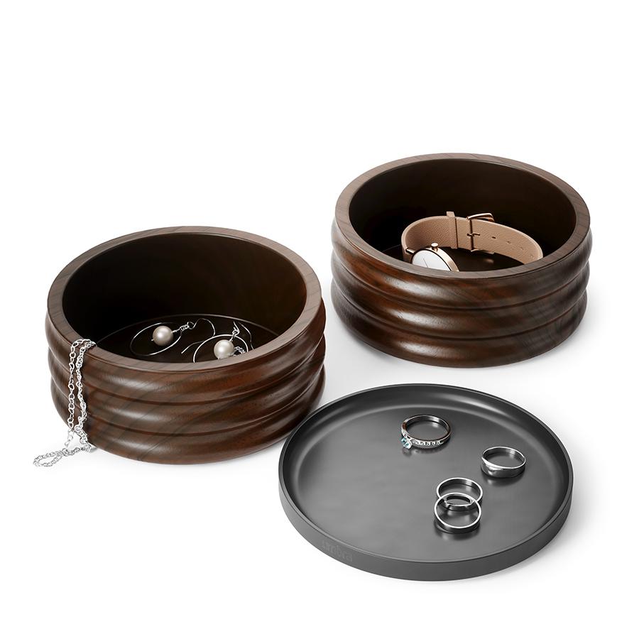 Двухъярусная шкатулка для украшений Tesora из натурального дерева — это элегантный синтез функциональности и современного дизайна. Каждый элемент шкатулки продуман до мелочей. Ярусы можно использовать вместе или раздельно, создавая индивидуальную систему хранения. Компактный размер и оригинальный дизайн делает шкатулку Tesora универсальным аксессуаром для прикроватной тумбочки, комода или туалетного столика. Особенности и преимущества: - Ярусы можно комбинировать с другими шкатулками коллекции. Это позволяет создавать удобную именно вам систему для хранения колец, серег и других аксессуаров, экономя место на поверхности. - Металлическую крышку с гальваническим покрытием можно использовать как поднос для сортировки или демонстрации украшений. - Натуральное дерево с неповторимым рисунком придает шкатулке особый шарм. Каждое изделие уникально благодаря природным вариациям оттенков и структуры волокон. - Текстура поверхности не только выглядит привлекательно, но и дарит приятные тактильные ощущения. Материалы: каучуковое дерево, цинк. Размеры: 13х13х11 см. Цвет: темный орех/черный. Для удаления пыли и загрязнений рекомендуется протирать чистой влажной тканью.