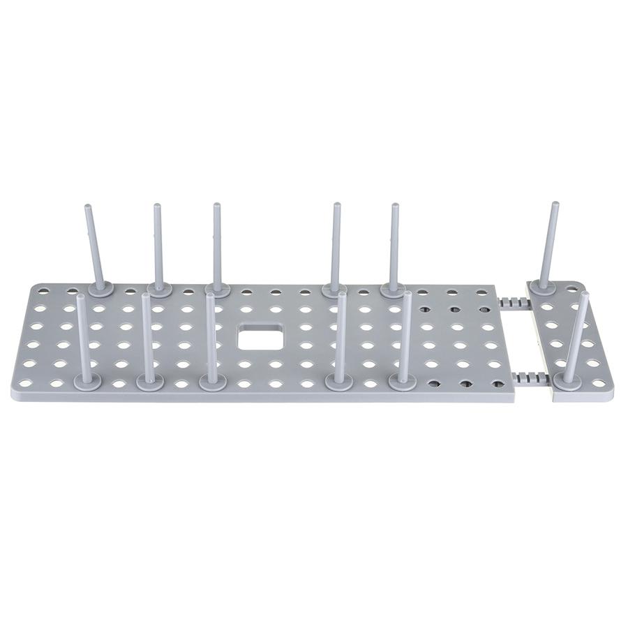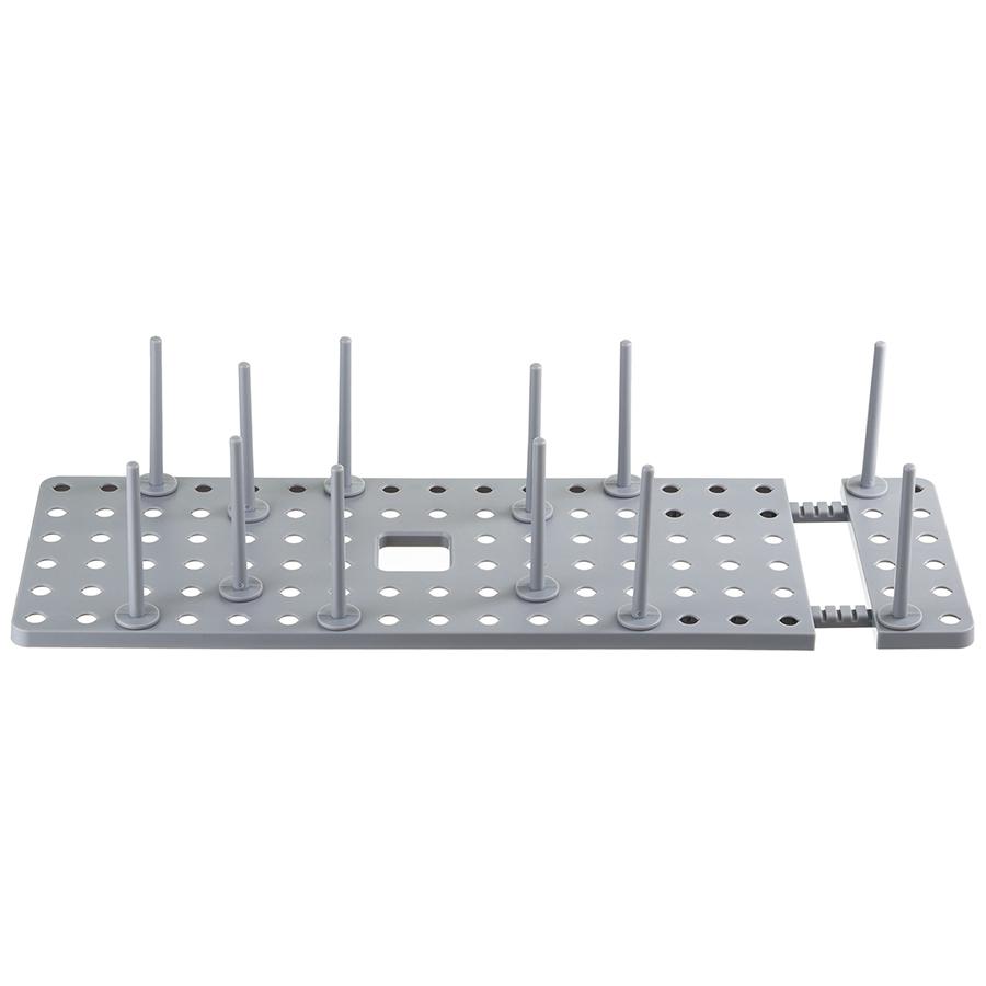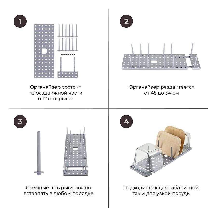Органайзер раздвижной Aristyd позволит организовать кухонное пространство и удобно разместить вымытую посуду. Особенности и преимущества: - Выполнен из прочного, практичного и долговечного полипропилена. - Имеет раздвижную конструкцию (45-54 см) и 12 съемных штырьков, которые можно вставлять в любом порядке. - Подходит как для небольшой, так и для габаритной посуды. Материал: пластик. Размеры: 54x15x10 см. Цвет: серый. Можно мыть вручную в теплой мыльной воде с помощью мягкой губки. Запрещается использование абразивных материалов и агрессивной бытовой химии.