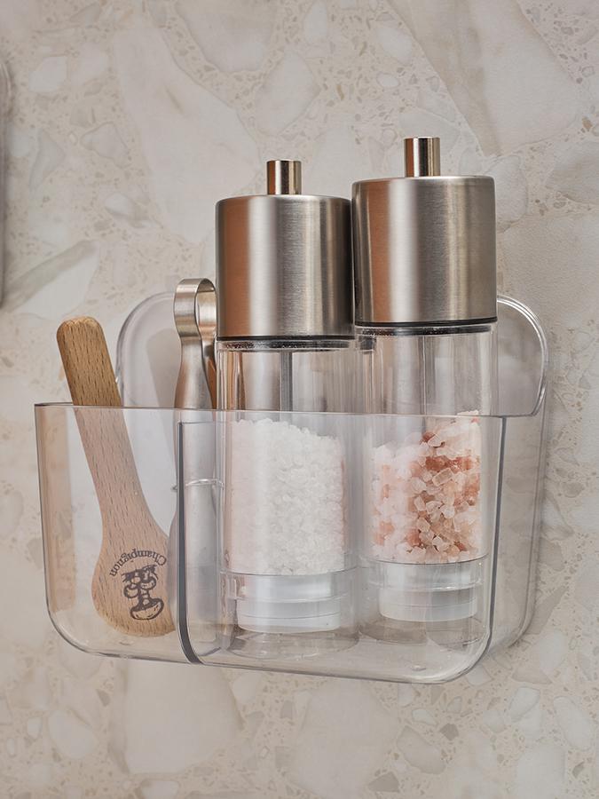 Органайзер подвесной Keep In от бренда Smart Solutions обеспечит удобное и компактное хранение аксессуаров на кухне или в ванной комнате. Особенности и преимущества: - Органайзер выполнен из термопластика, который обладает высокой прочностью, термостойкостью, не впитывает загрязнения, легко очищается и долго служит. - Современный минималистичный дизайн делает его прекрасным дополнением любого интерьера. - Имеет два отделения для раздельного хранения аксессуаров. - Благодаря подвесной конструкции не занимает полезное пространство. Материал: термопластик. Размеры: 18х9,5х14 см. Максимальная нагрузка: 5 кг. Можно мыть вручную в теплой мыльной воде с помощью мягкой губки. Запрещается использование агрессивной бытовой химии и абразивных материалов.