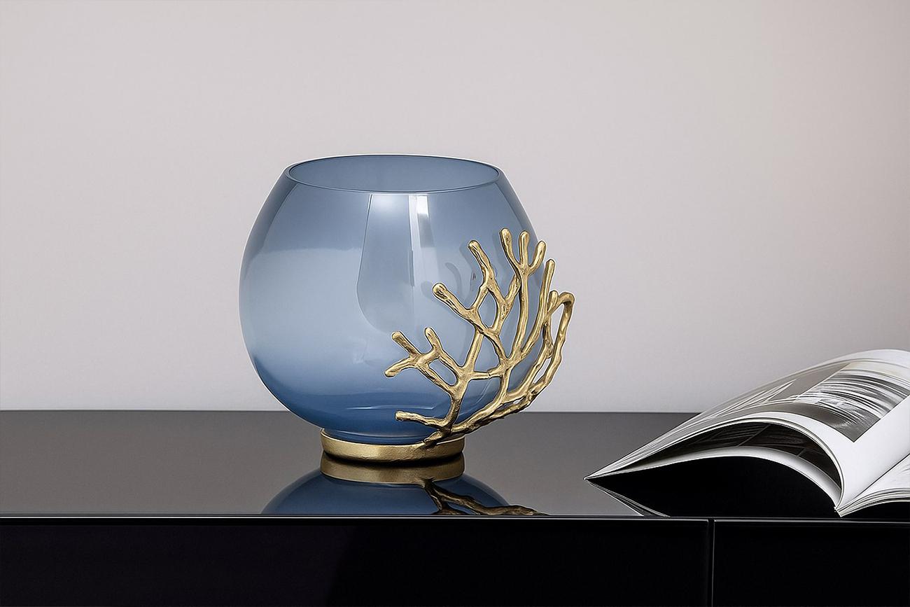 Дизайнерский стеклянный подсвечник отличается эффектным дизайном и изящной формой. За счет декора из позолоченного алюминия он выглядит необычно, но остается классическим решением для украшения интерьера в стиле ар-деко. Форма бокала позволяет использоват...
