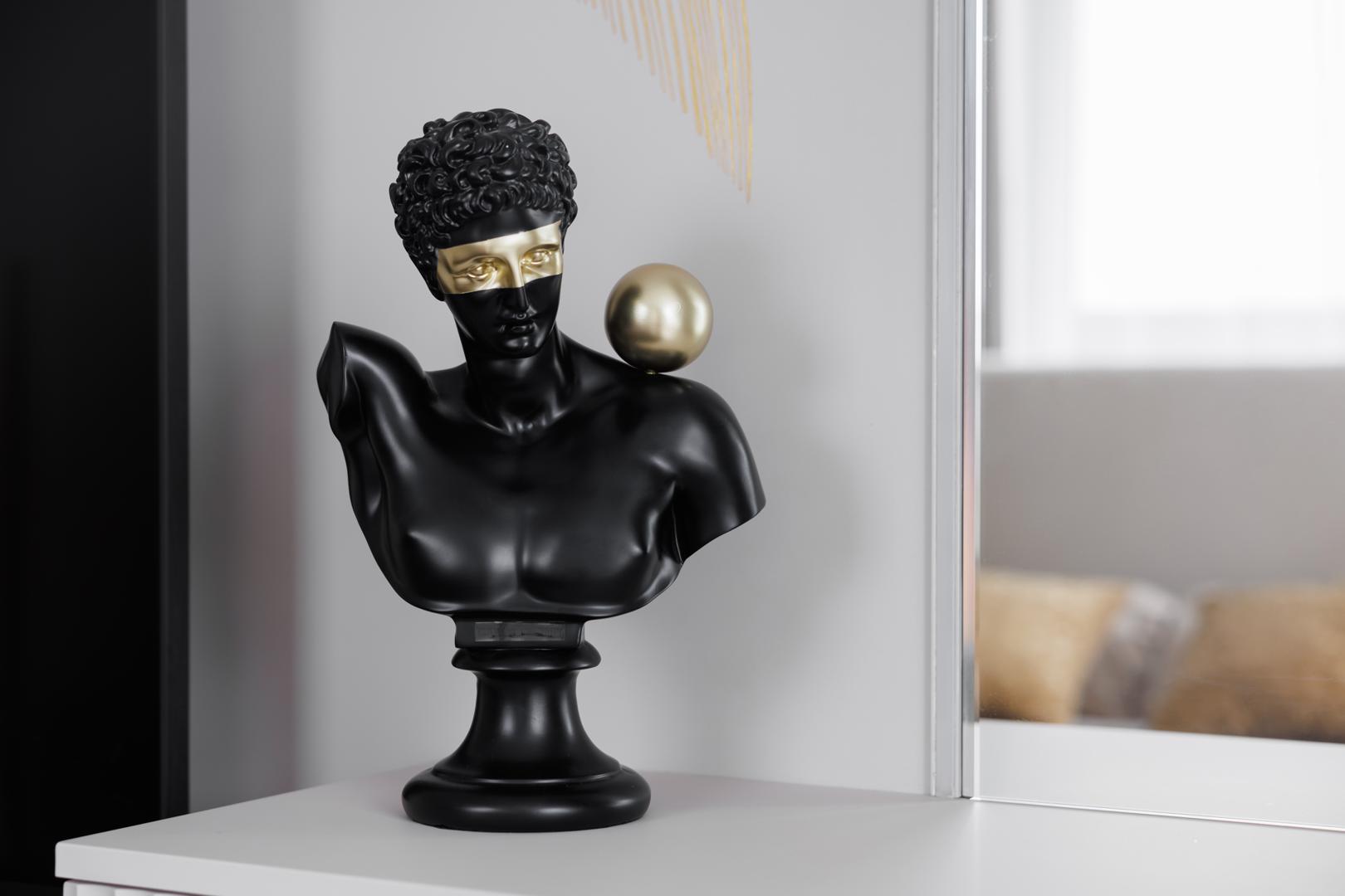 description-full - Эта черная статуэтка-бюст – это не просто стилизация под классическую скульптуру. Это смелый интересный ход, который придает интерьеру глубину и интригу. Матовый черный цвет придает декору современное звучание, а золотые элементы акцентируют внимание на деталях, создавая интересный контраст. Этот арт-объект будет уместен в минималистичном лофте, эклектичной гостиной и даже в стильном офисе, добавив нотку интеллектуальной провокации. Это не просто декор, это заявление о вашем нестандартном вкусе и умении видеть красоту в неожиданных формах.
