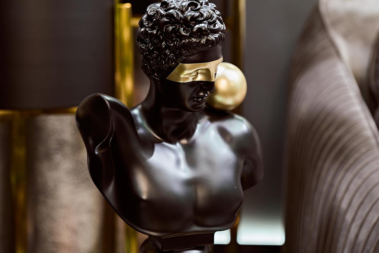 Эта черная статуэтка-бюст – это не просто стилизация под классическую скульптуру. Это смелый интересный ход, который придает интерьеру глубину и интригу. Матовый черный цвет придает декору современное звучание, а золотые элементы акцентируют внимание на ...