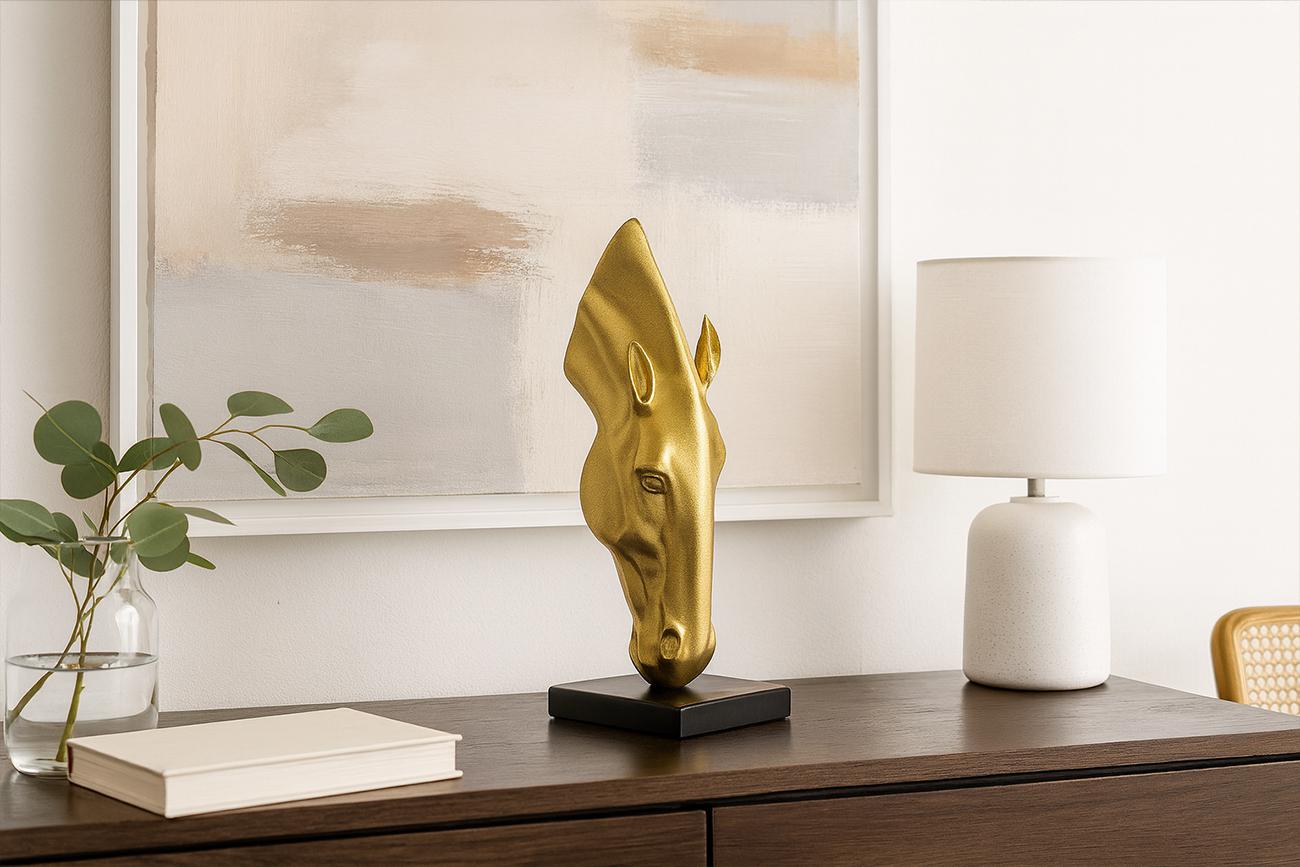 description-full - Эта золотая статуэтка воплощает в себе эстетику современного минимализма, где плавность линий встречается с экспрессией благородного цвета. Декоративная голова лошади в золотом исполнении перестает быть просто предметом декора, превращаясь в выразительный интерьерный акцент, символизирующий внутреннюю силу и устремленность вперед. Фактурная поверхность с легким блеском мягко отражает свет, подчеркивая атлетичный силуэт. Такой арт-объект безупречно дополнит пространство рабочего кабинета в стиле неоклассика или станет центром композиции в гостиной лофт. Лаконичное черное основание придает фигуре устойчивость и визуальную завершенность, делая аксессуар идеальным подарком для ценителей эксклюзивного дизайна и статусных вещей, меняющих атмосферу дома.