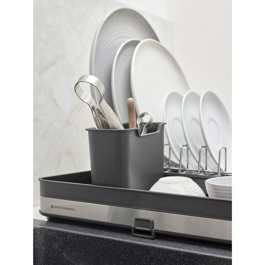 Сушилка Atle – компактная, но в то же время вместительная модель с раздвижной конструкцией, в которой предусмотрены отделения для посуды и кухонных принадлежностей. Удобное размещение и надежную фиксацию тарелок и других емкостей обеспечивают железные разделители. Поддон выполнен из практичного полипропилена, который легко моется. Стальные элементы на корпусе имеют специальное покрытие против отпечатков пальцев. Настольную сушилку можно размещать в любом месте и для ее установки не требуется делать отверстия в стене. Для хорошей устойчивости в раздвижном состоянии предусмотрены специальные ножки, расположенные в нижней части сушилки, которые выдвигаются одним движением руки. Материалы: полипропилен, сталь, железо. Размеры в сложенном виде: 36,3х30,2х16,8 см. Размеры в разложенном виде: 36,3х52х16,8 см. Цвет: черный. Сушилку можно очищать от загрязнений в теплой мыльной воде с помощью мягкой губки. Запрещается использование агрессивной бытовой химии и абразивных материалов.