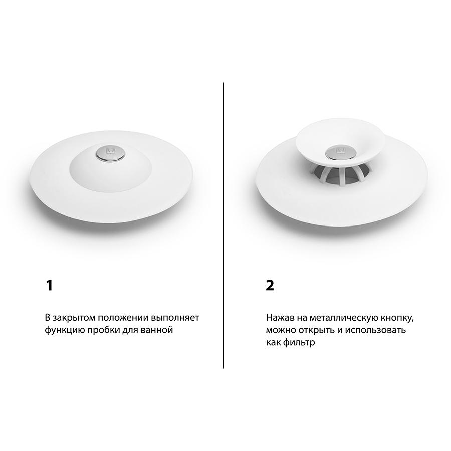 Фильтр поможет поддерживать исправную работу слива. Нажмите на металлическую кнопку в центре, чтобы вода сливалась через фильтр, задерживая в нем мусор. Нажмите на силиконовые крылышки вокруг кнопки, и фильтр закроет слив, чтобы вы смогли наполнить ванну. Сочетается с другими аксессуарами из коллекции Flex. Материал: силикон, нержавеющая сталь. Размеры: 10х10х3 см. Цвет: белый. Можно мыть в теплой мыльной воде при помощи мягкой губки.