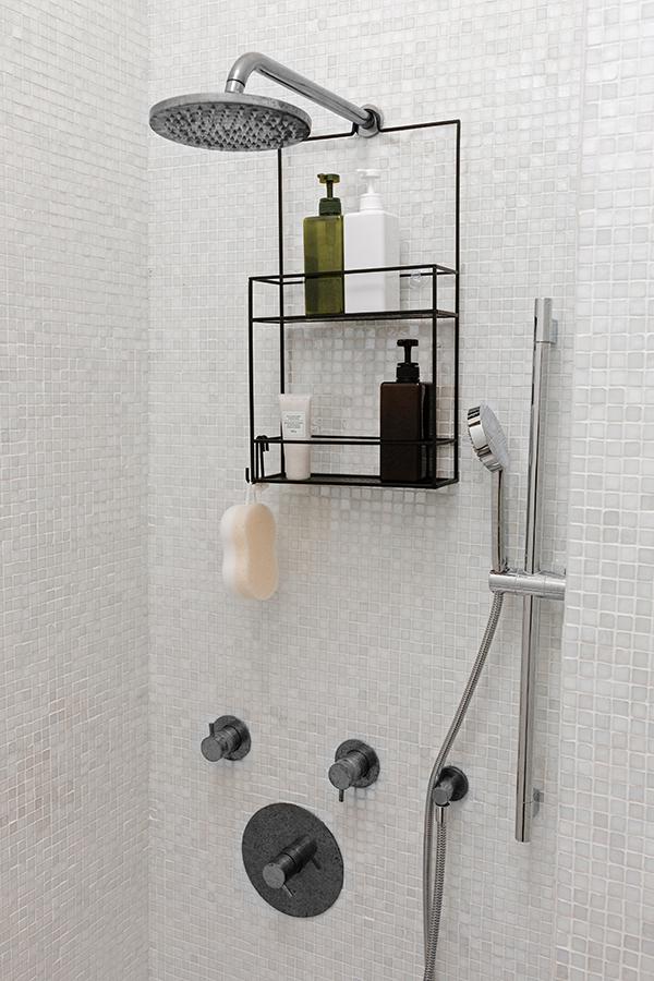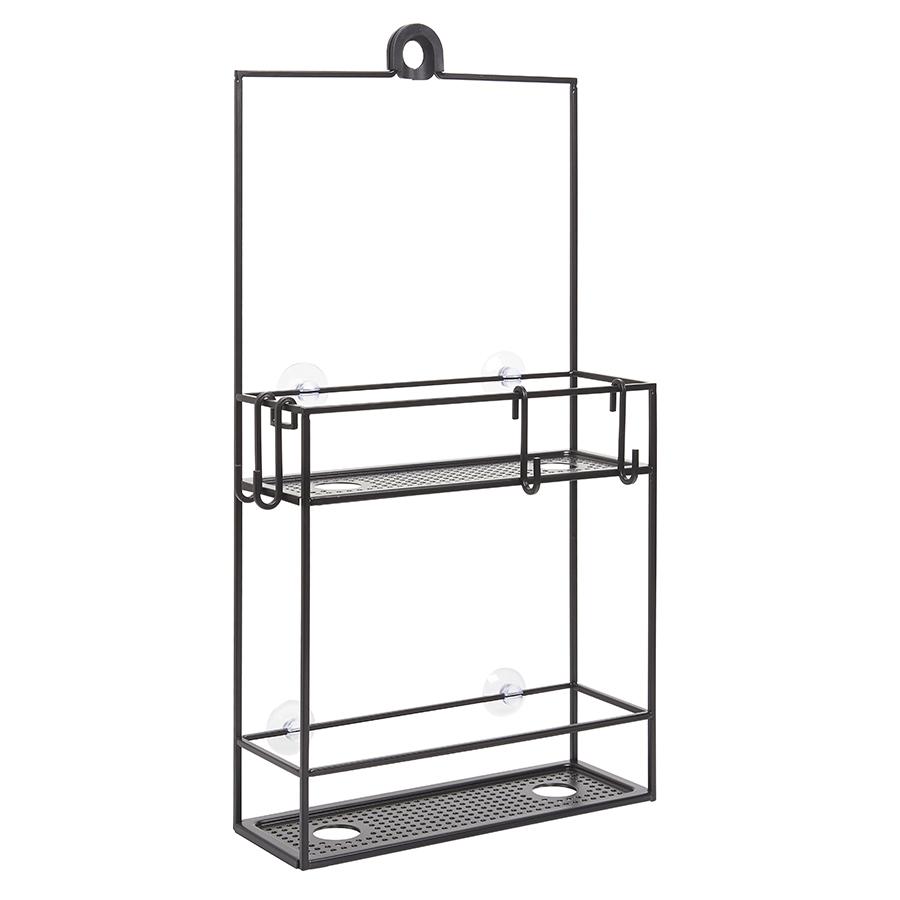Очень удобный металлический органайзер, дизайн которого навеян геометрическими абстракциями художника Пита Мондриана, поможет навести порядок в ванной. Оснащен двумя вместительными полками для душевых принадлежностей и четырьмя S-образными крючками для губок и других мелочей. В полках предусмотрены специальные отверстия для стекания воды. Может крепиться к стене при помощи присосок или подвешиваться за прорезиненный крючок.