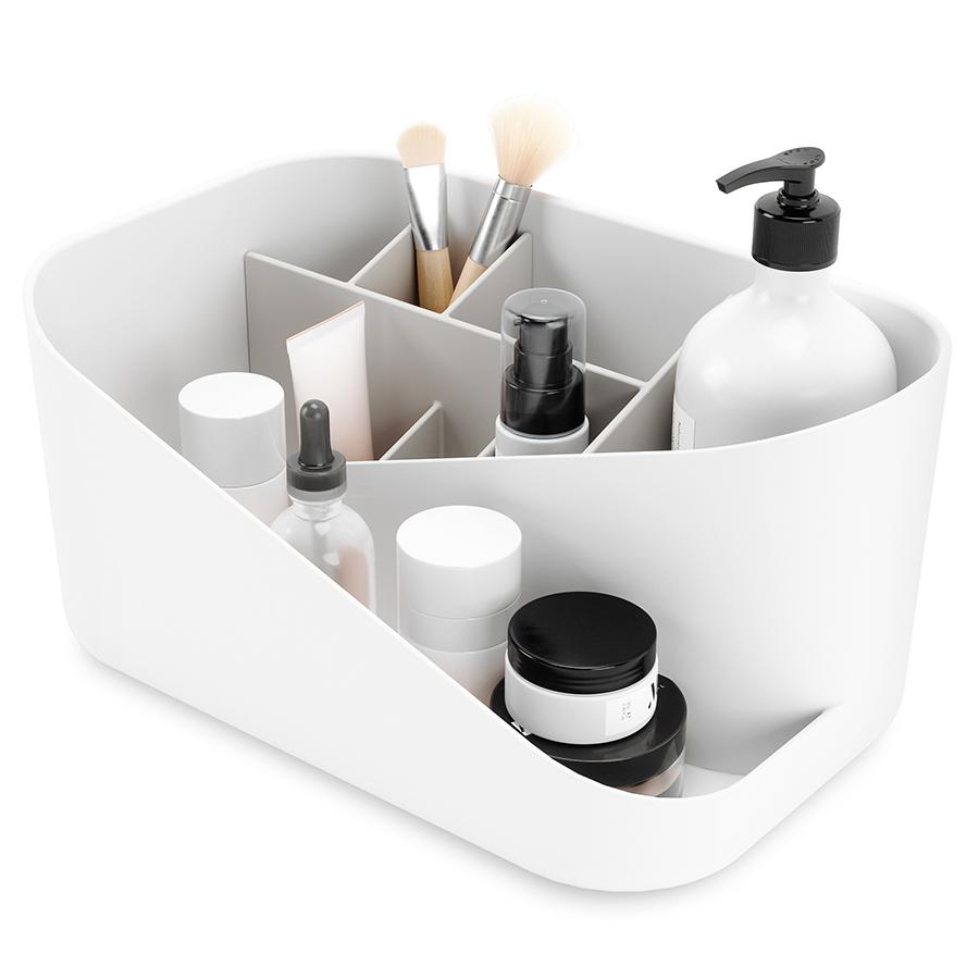 Стильный органайзер позаботится о сохранности косметики и аксессуаров. Несколько отделений позволяют организованно размещать предметы разных размеров. Компактный органайзер не занимает много места в ванной или на туалетном столике. Материал: переработанный ABS-пластик.
