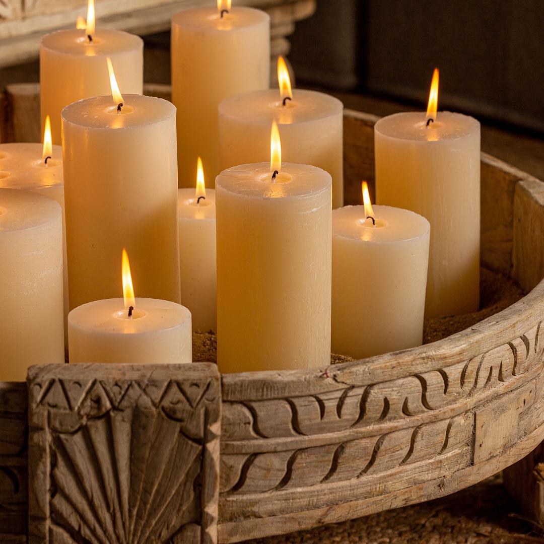 Круглая свеча, кремового цвета, классический стиль. Изготовлен из воска.