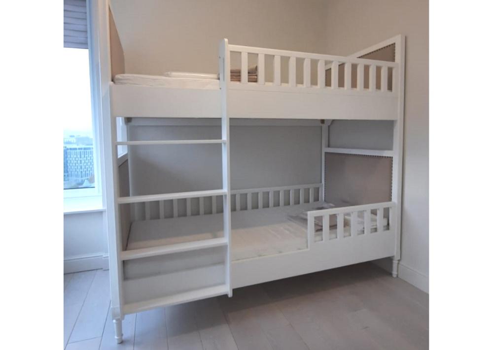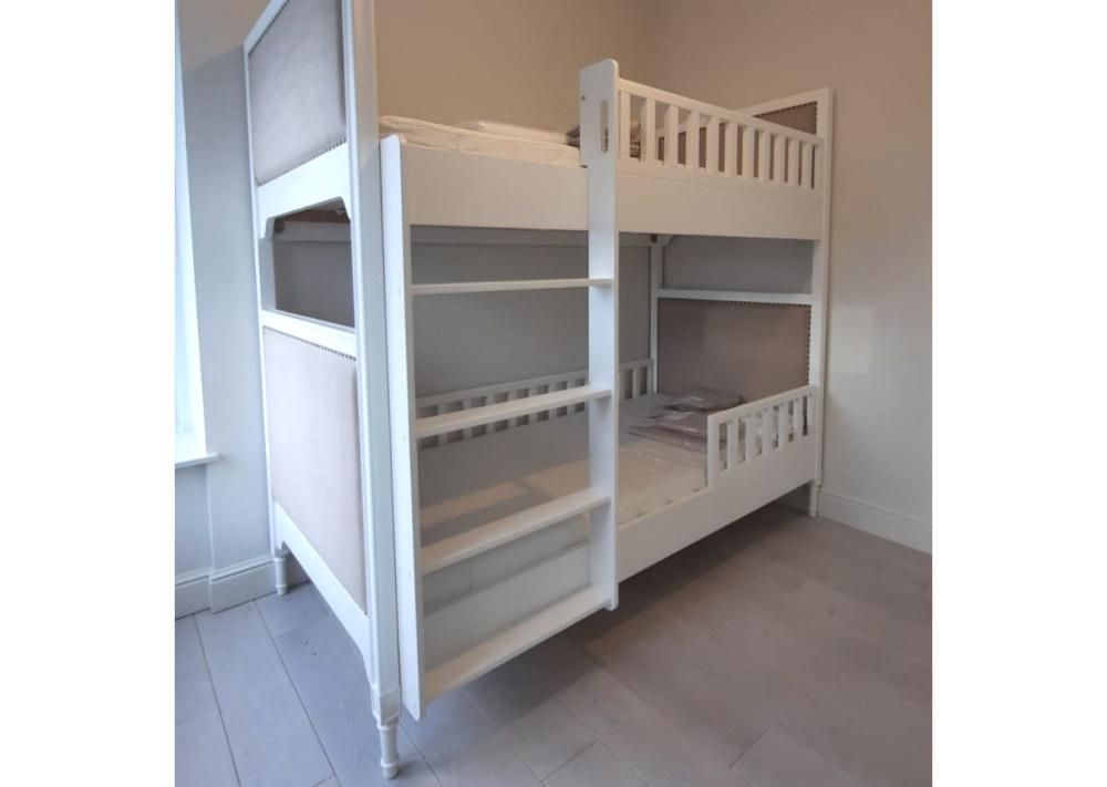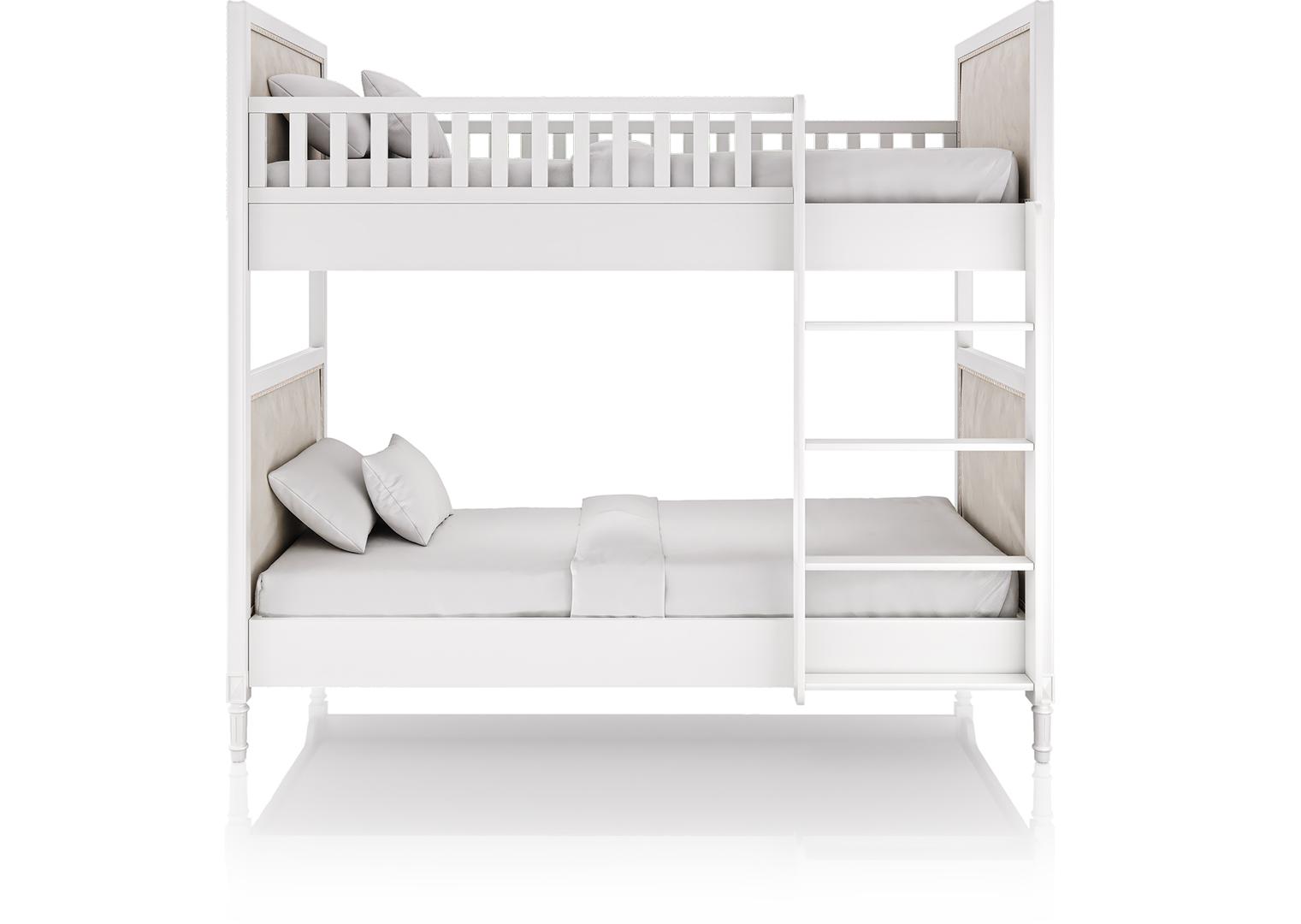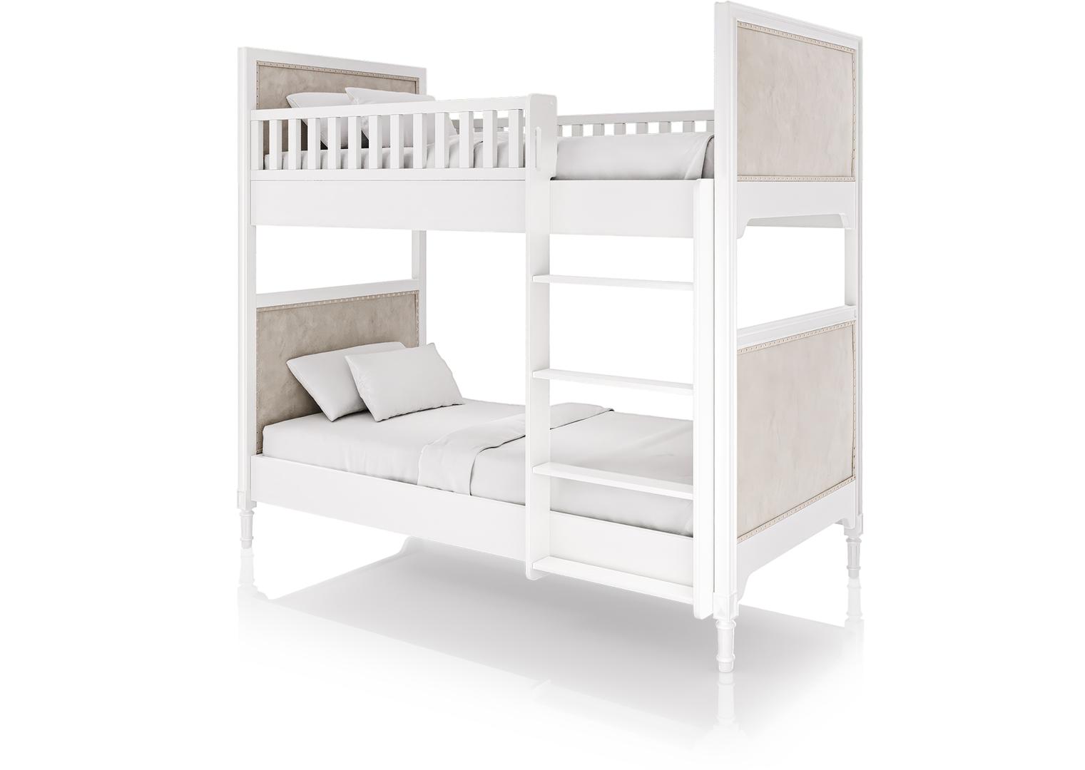 Двухъярусная кровать Elit в современном классическом стиле Имеет просторное спальное место 90*200 см Удобная лестница позволяет без труда забраться на второй этаж Дополнительно на нижний ярус кровати можно установить защитный бортик Материал: массив бука Обивка: ткань микрошенилл