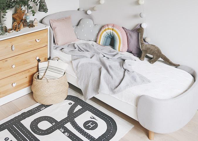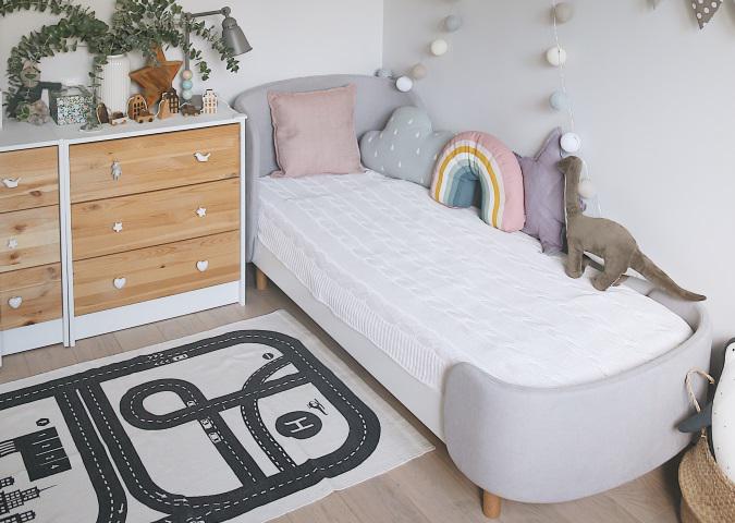 Кровать KIDI Soft имеет небольшую высоту идеально подходящую по росту детям от 3 до 7 лет (спальное место 67*167 см) Закруглённые углы и мягкая приятная на ощупь обивка делают кроватку уютной и безопасной Съемные чехлы, при необходимости можно снять и постирать или поменять цвет обивки Вы можете приобрести дополнительный комплект чехлов Для безопасности на кровать можно установить один или два защитных бортика Материал: бук, береза Чехлы: ткань микрошенилл *Матрас докупается отдельно *Защитный бортик докупается отдельно