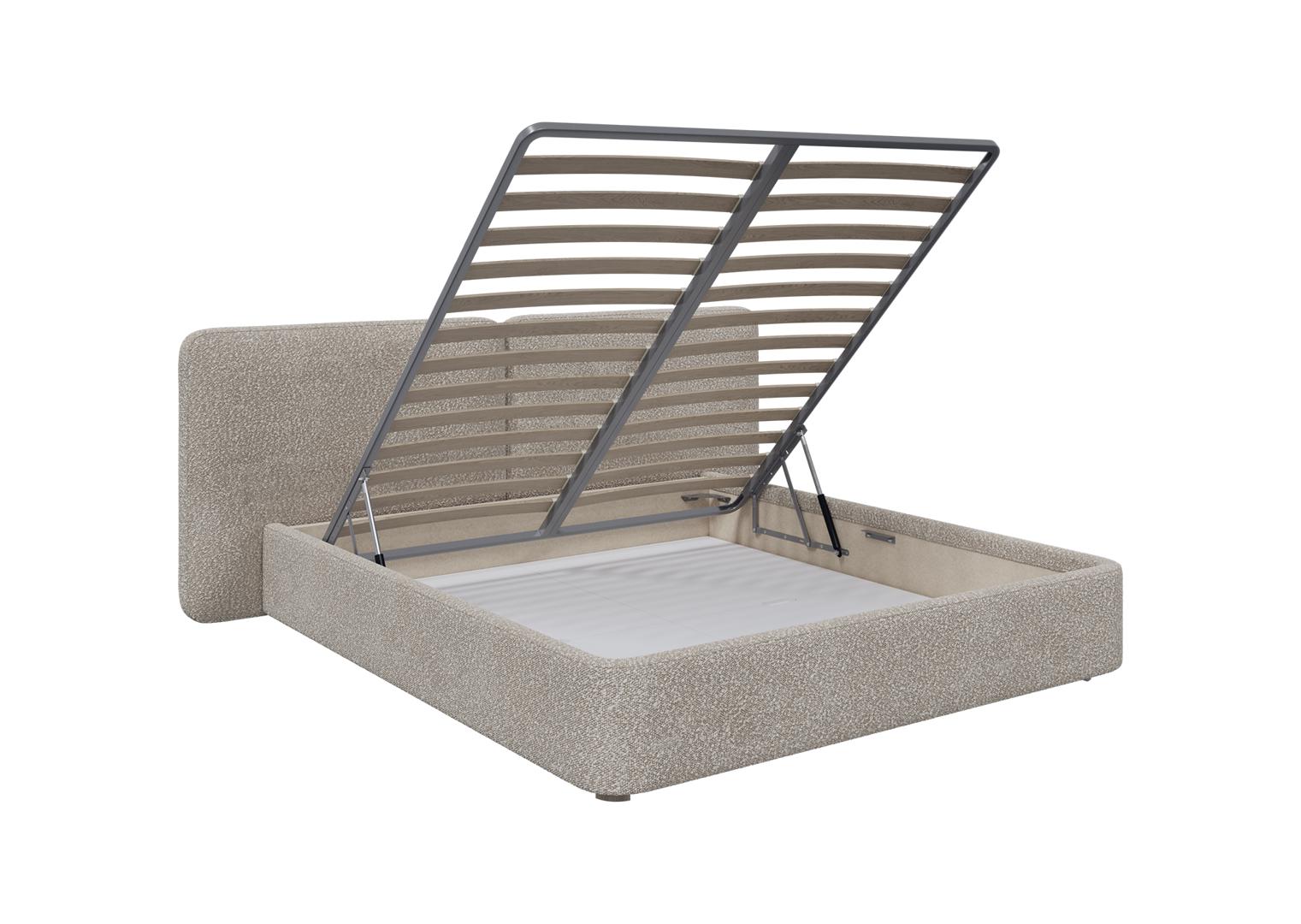 Двуспальная кровать Hub Soft с подъемным механизмом и ящиком для хранения Размер спального места 200*200 см Внешние габариты: 255*100*220* см - ширина по изголовью 255 см - ширина кровати (спального места) 208 см - высота изголовья 100 см Каркас выполнен из массива березы Обивка: ткань букле Ножки: бук