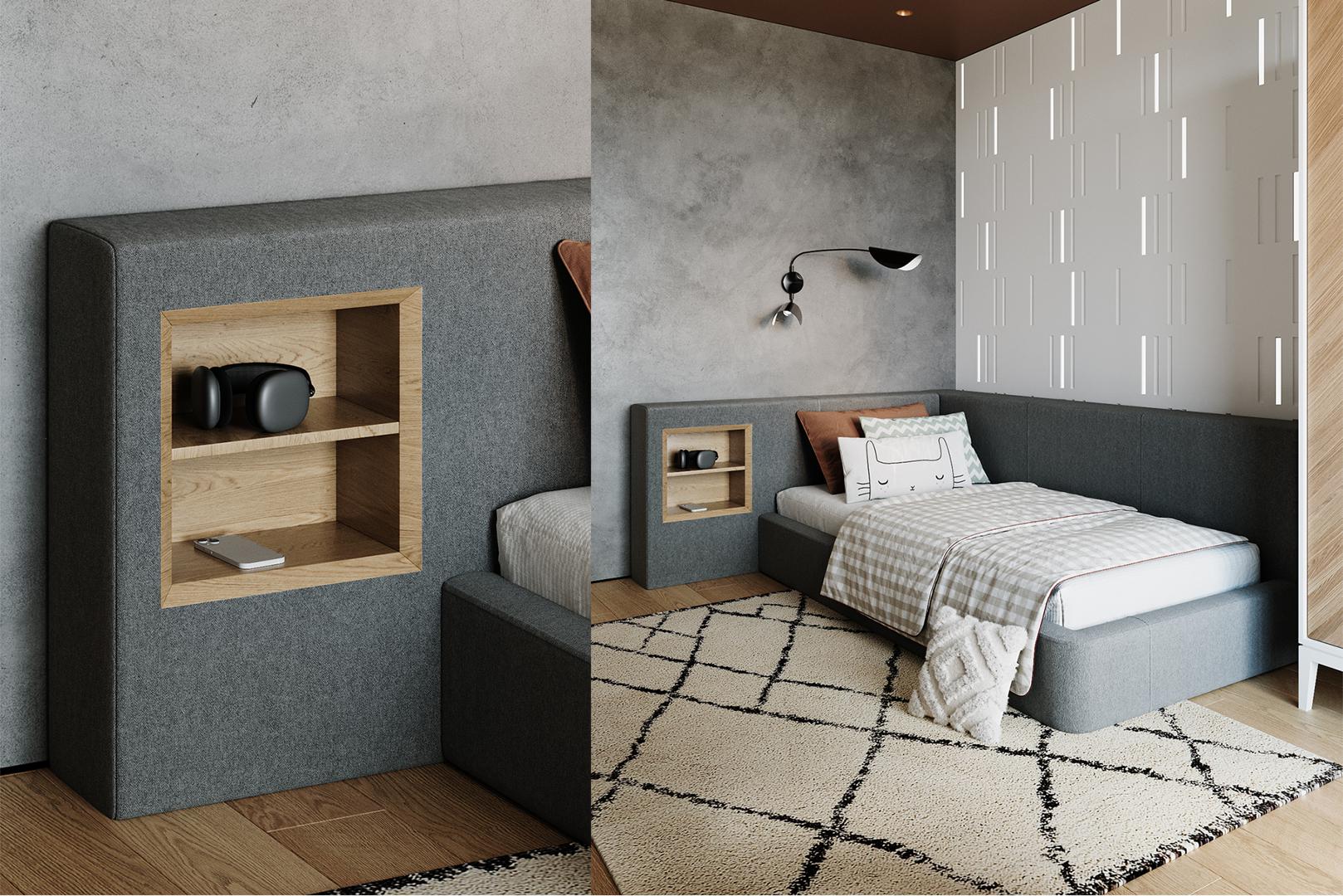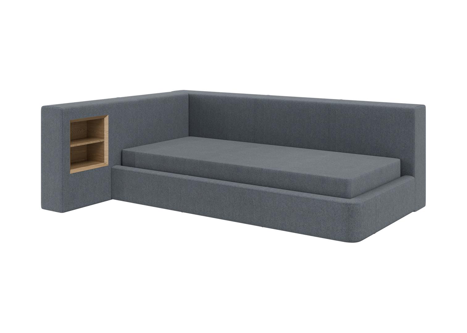 Диван-кровать Cube c нишей M Оснащена подъёмным механизмом, местом для хранения, нишей и розеткой Материал кровати: бук, береза Материал ящика: ЛДСП Текстильная обивка: ткань твид Размер спального места: 90х200 см Основание под матрас: ортопедические ламели *Матрас и чехол на матрас покупаются отдельно