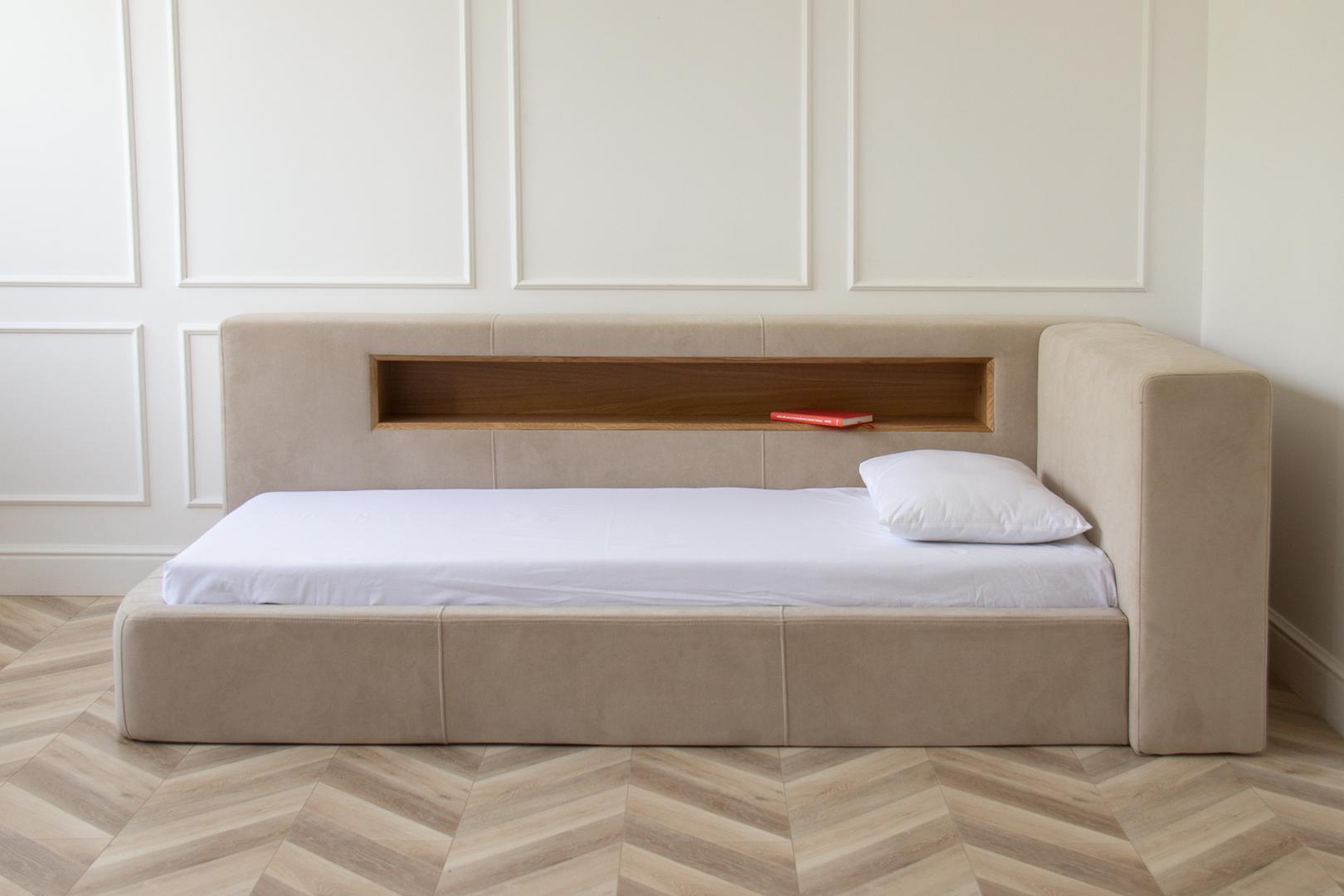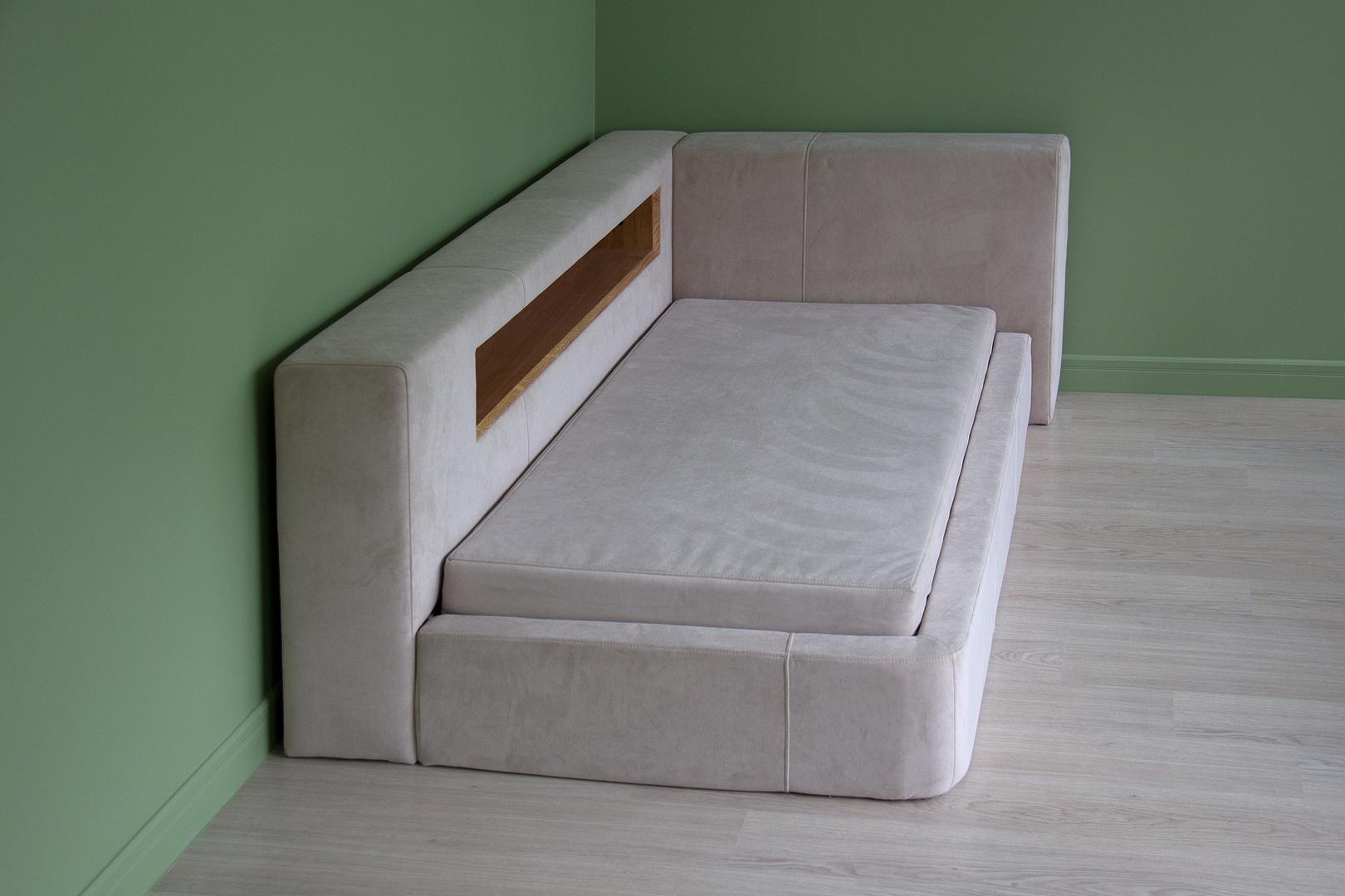 Диван-кровать Cube c нишей L Оснащена подъёмным механизмом, местом для хранения, нишей и розеткой Материал кровати: бук, береза Материал ящика: ЛДСП Текстильная обивка: антивандальная ткань Размер спального места: 90х200 см Основание под матрас: ортопедические ламели *Матрас и чехол на матрас покупаются отдельно