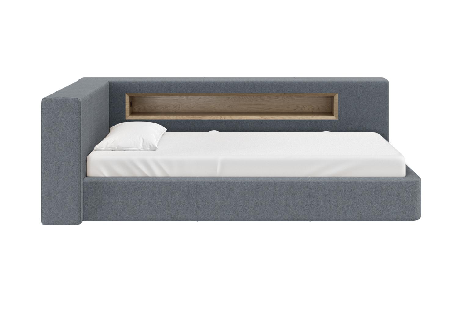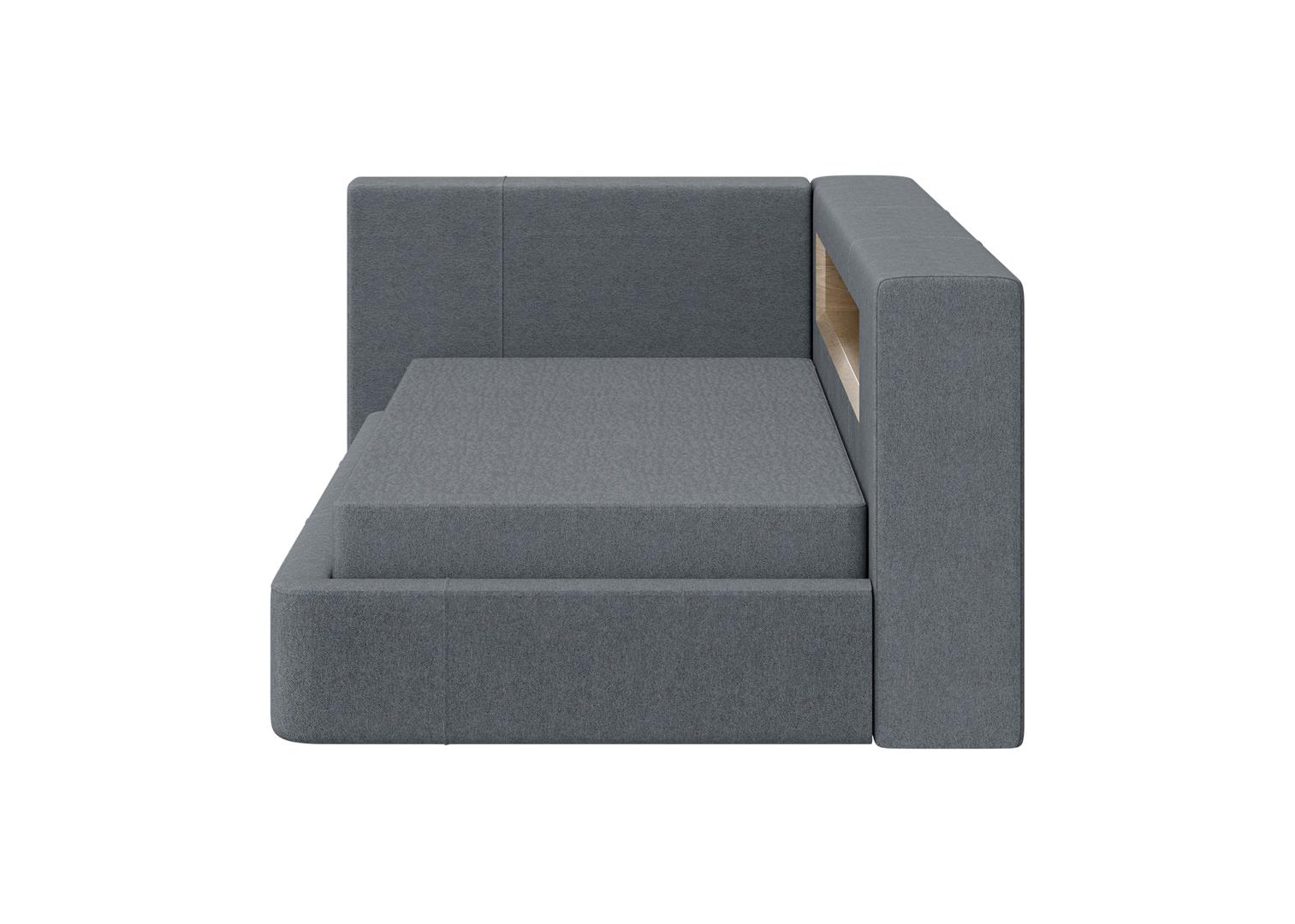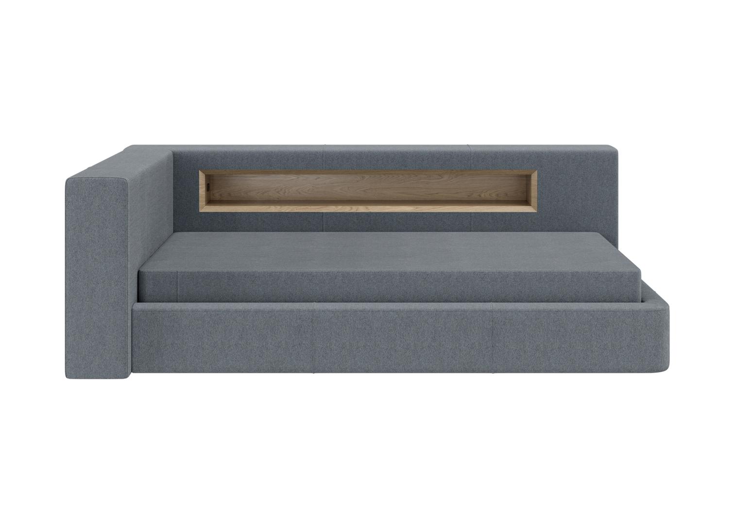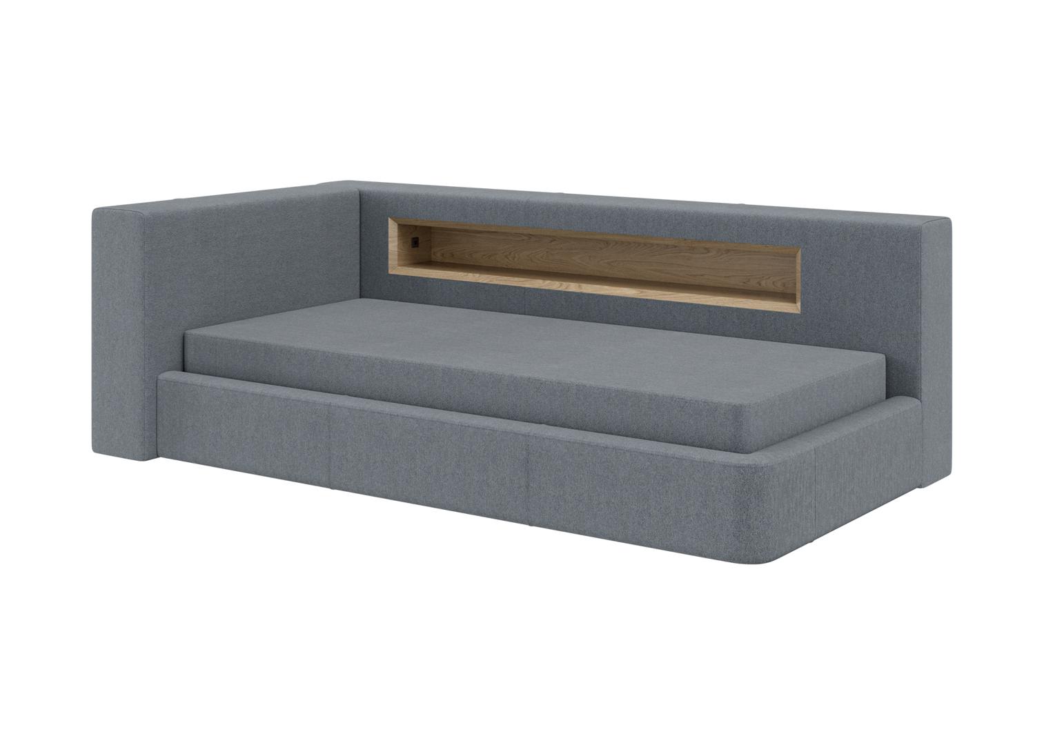 Диван-кровать Cube c нишей L Оснащена подъёмным механизмом, местом для хранения, нишей и розеткой Материал кровати: бук, береза Материал ящика: ЛДСП Текстильная обивка: ткань твид Размер спального места: 90х200 см Основание под матрас: ортопедические ламели *Матрас и чехол на матрас покупаются отдельно