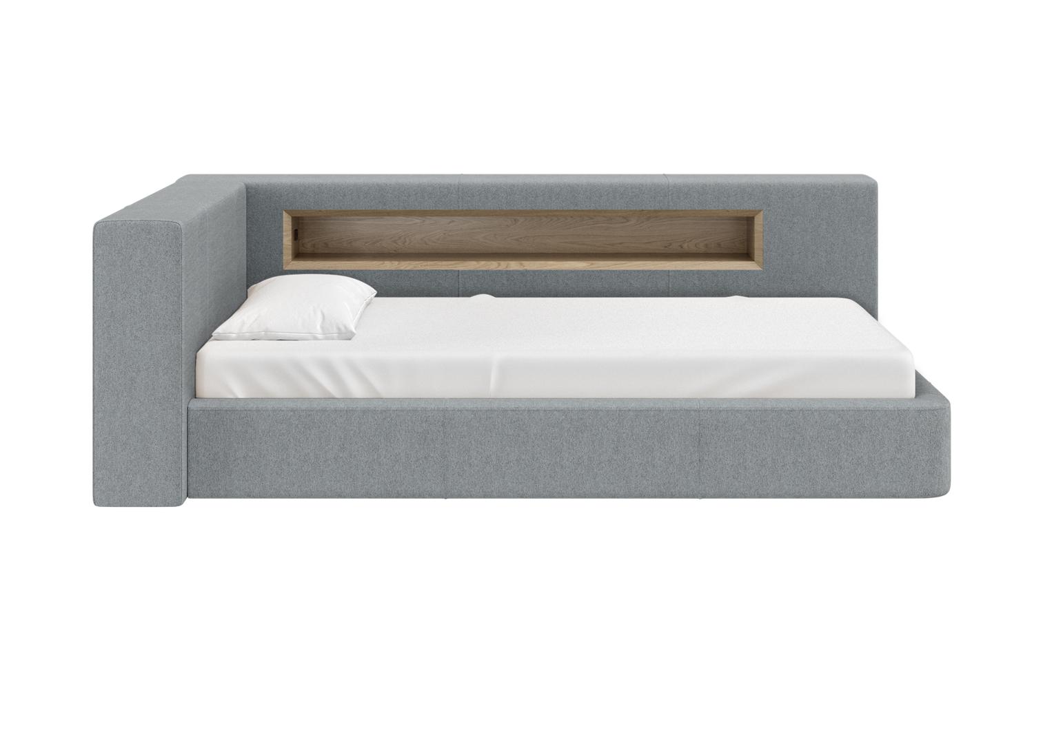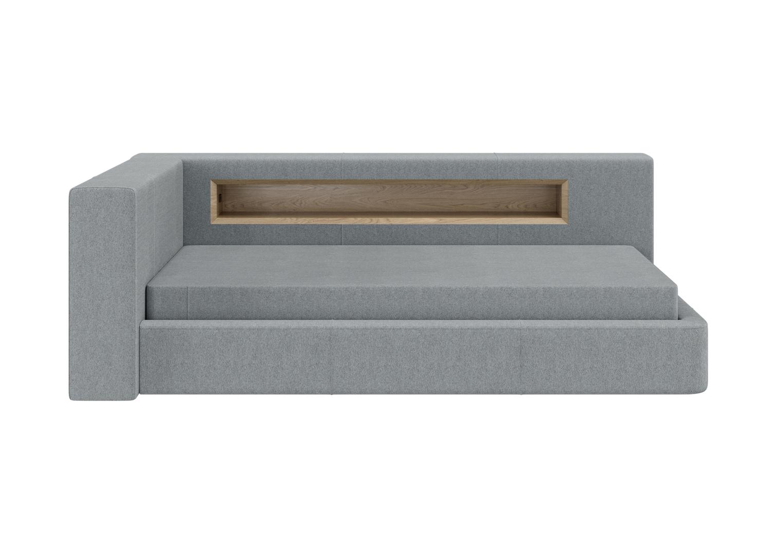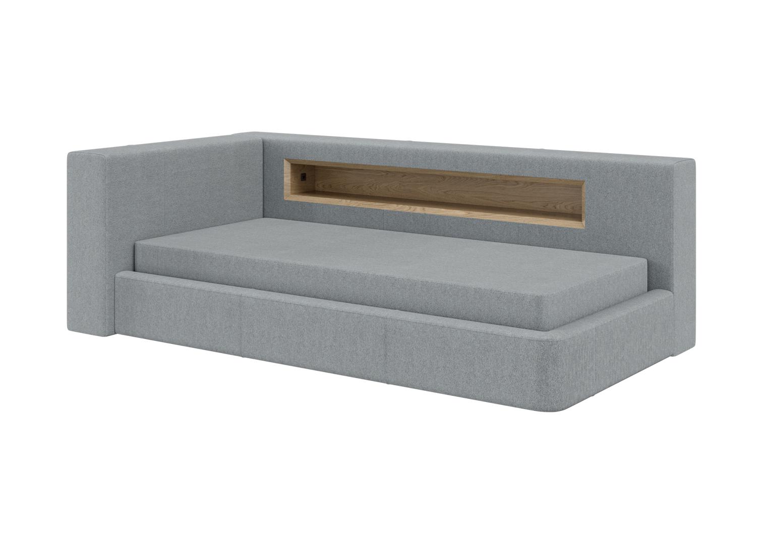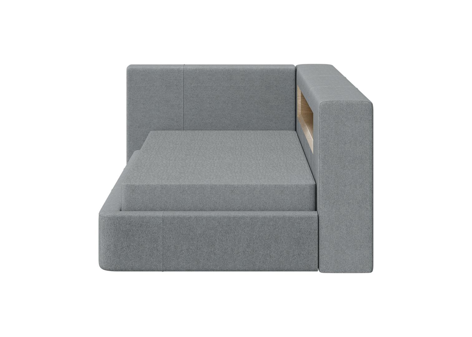 Диван-кровать Cube c нишей L Оснащена подъёмным механизмом, местом для хранения, нишей и розеткой Материал кровати: бук, береза Материал ящика: ЛДСП Текстильная обивка: ткань твид Размер спального места: 90х200 см Основание под матрас: ортопедические ламели *Матрас и чехол на матрас покупаются отдельно