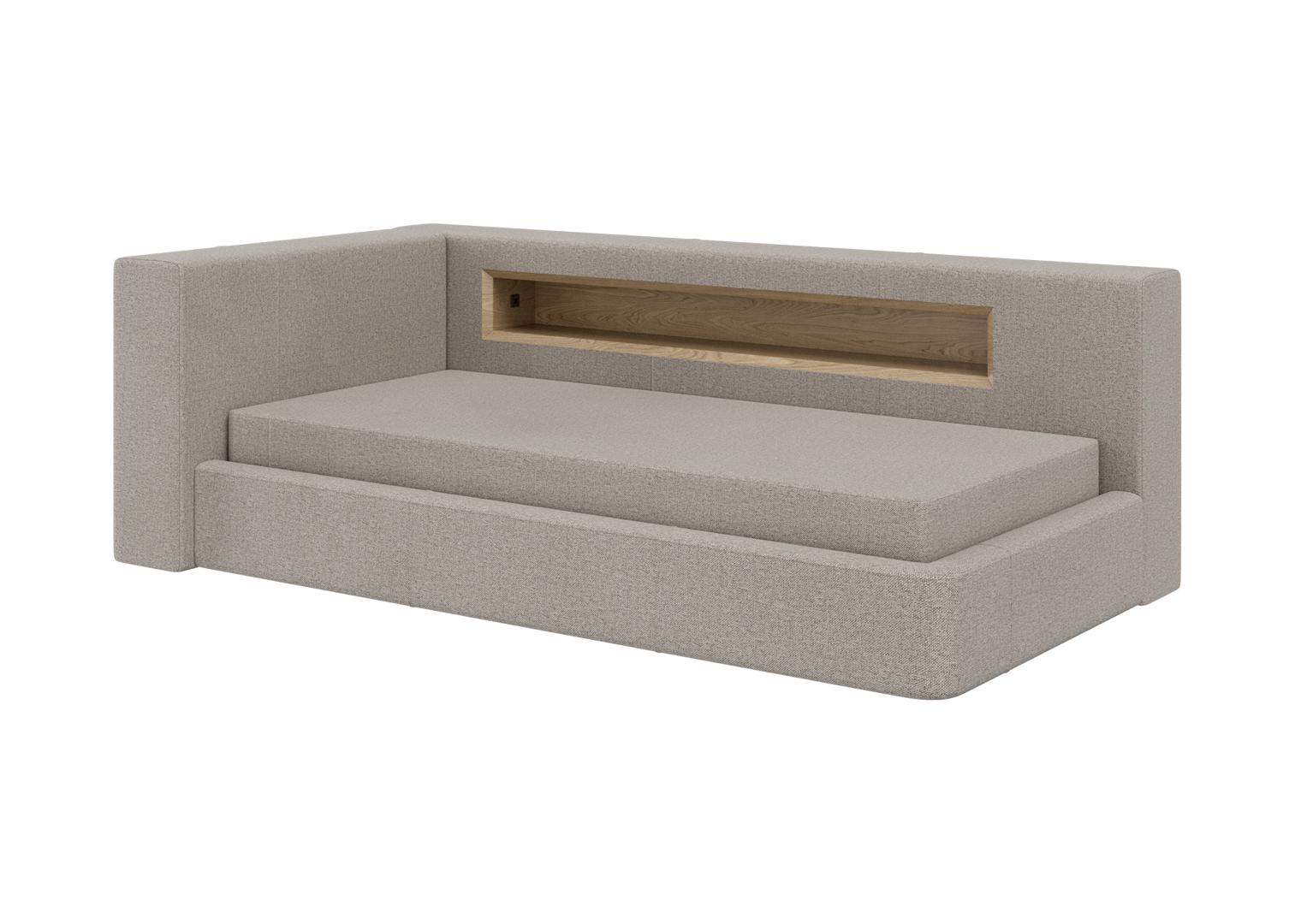 Диван-кровать Cube c нишей L Оснащена подъёмным механизмом, местом для хранения, нишей и розеткой Материал кровати: бук, береза Материал ящика: ЛДСП Текстильная обивка: ткань рогожка Размер спального места: 90х200 см Основание под матрас: ортопедические ламели *Матрас и чехол на матрас покупаются отдельно