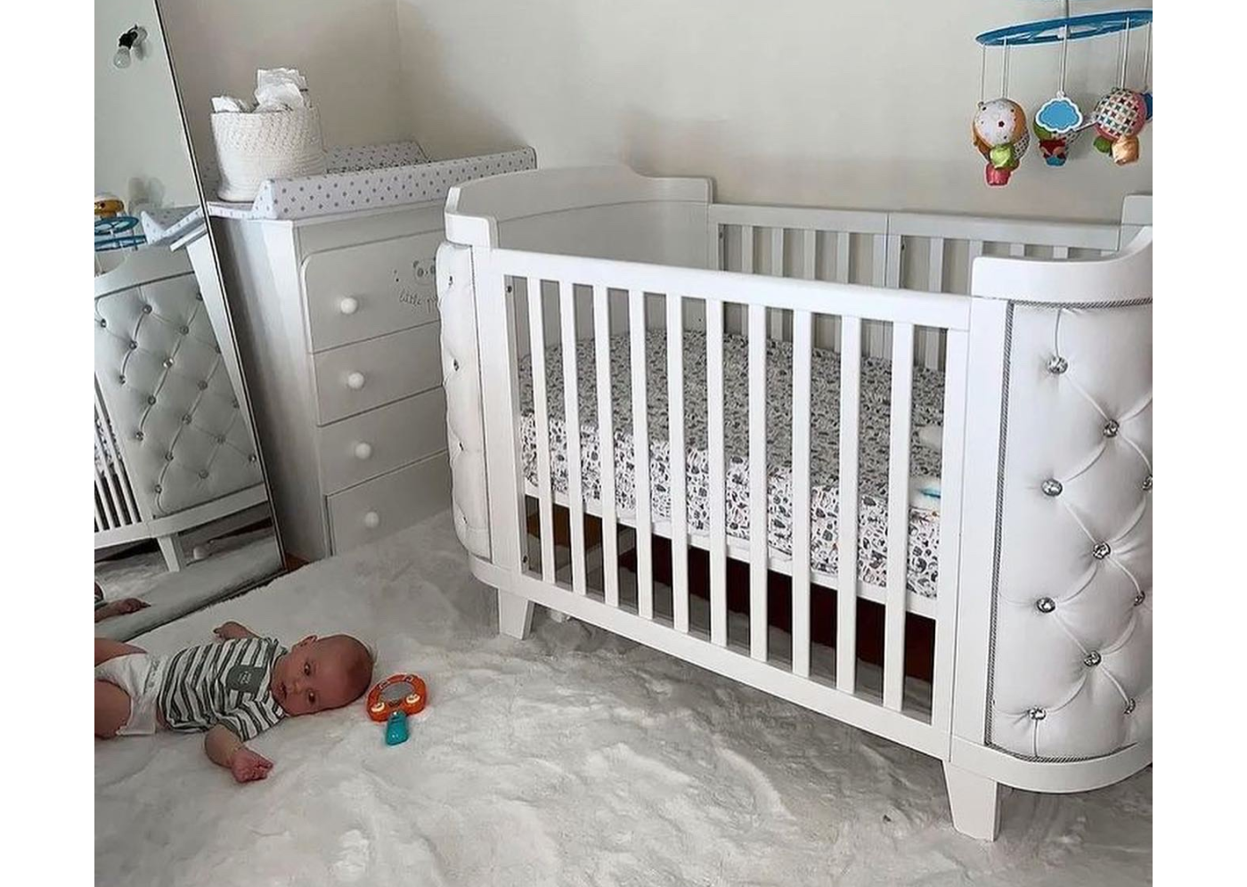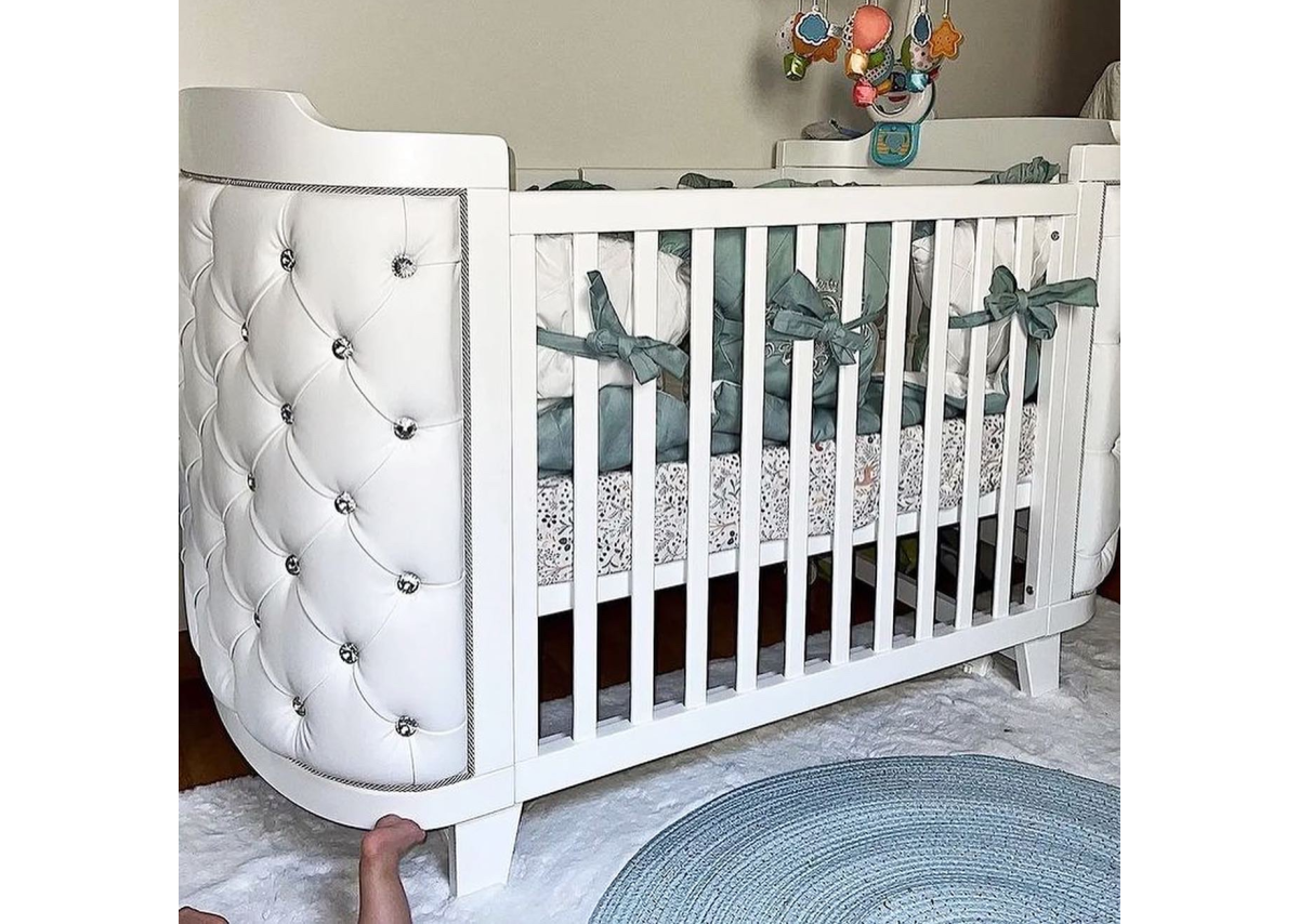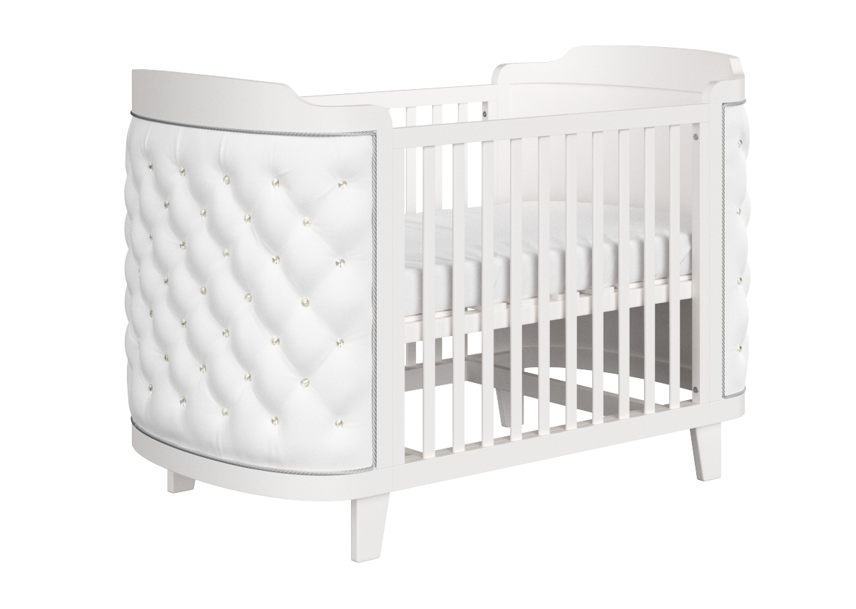 Кроватка-трансформер elegance имеет увеличенный размер спального места, подходит малышам с рождения до 4 лет. Три положения уровня дна. Боковая стеночка снимается и можно использовать кроватку как приставную или как небольшой диванчик. Трансформации кроватки: Люлька 74*95 см (спальное место 70*90 см) Кроватка 74*134 см (спальное место 70*134 см) Приставная кроватка Диванчик *бортик-ограничитель докупается отдельно Материал: массив бука Обивка: экокожа, стразы
