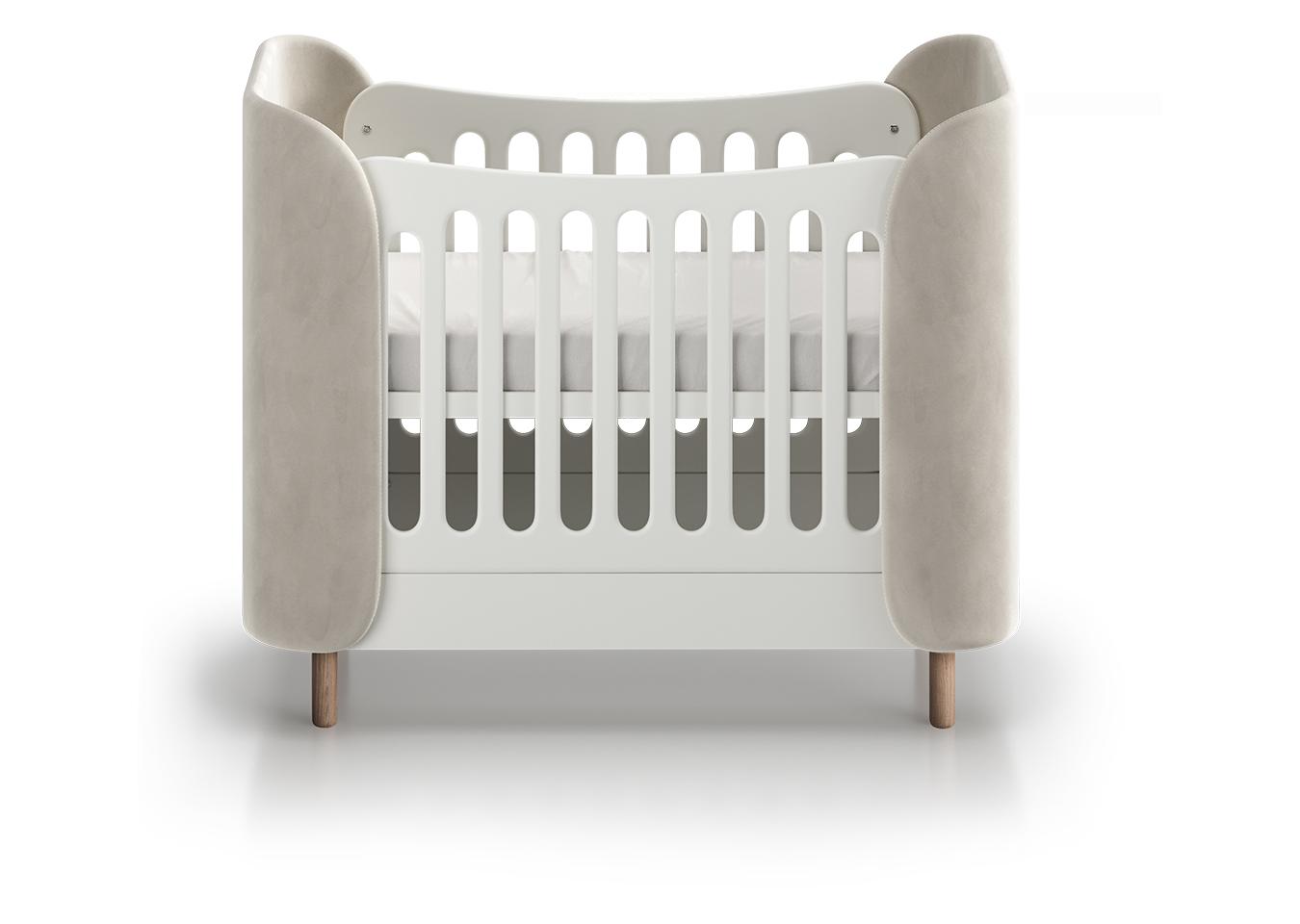 Кроватка KIDI Soft mini cпальное место 60*120 см с мягкими текстильными спинками Спальное место: ширина 60 см длина 120 см У кроватки 4 положения уровня дна - верхнее положение для новорожденных - среднее положение для деток от 6 месяцев - нижнее положение 1 для деток от 1 года (манеж) - нижнее положение 2 для деток от 1 года (диванчик, можно использовать с защитным бортиком) Материал: бук, береза, мдф Чехлы: антивандальная ткань *Матрас, маятник и защитный бортик докупаются отдельно