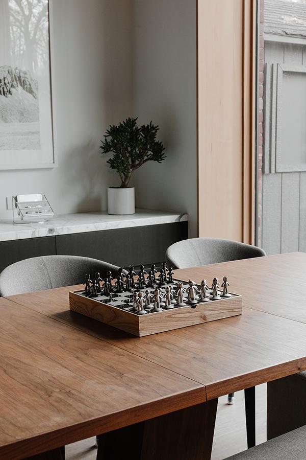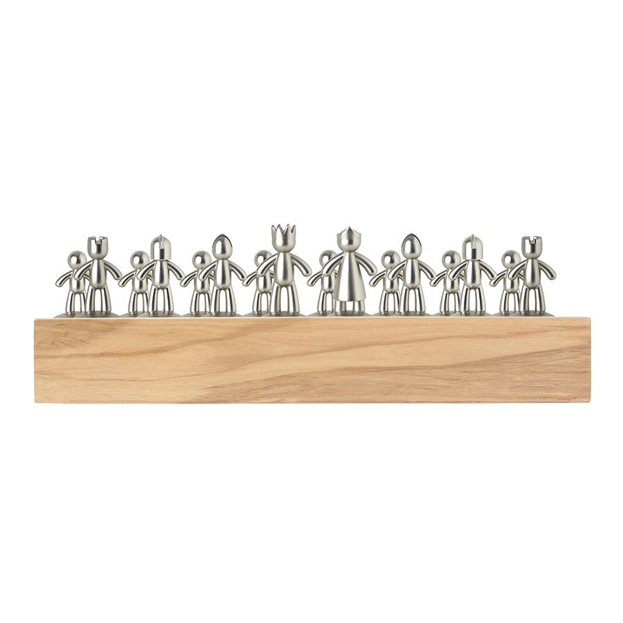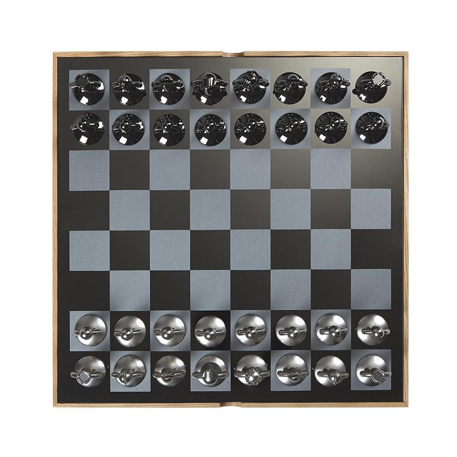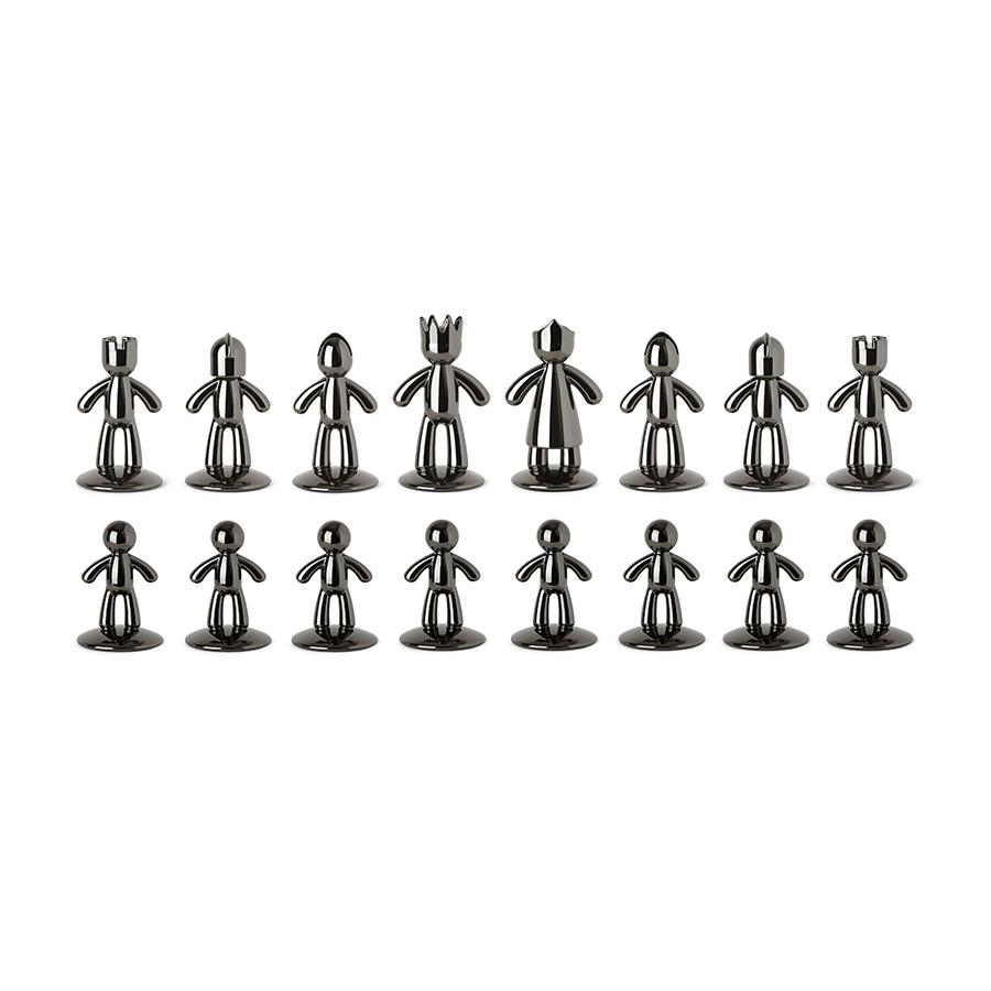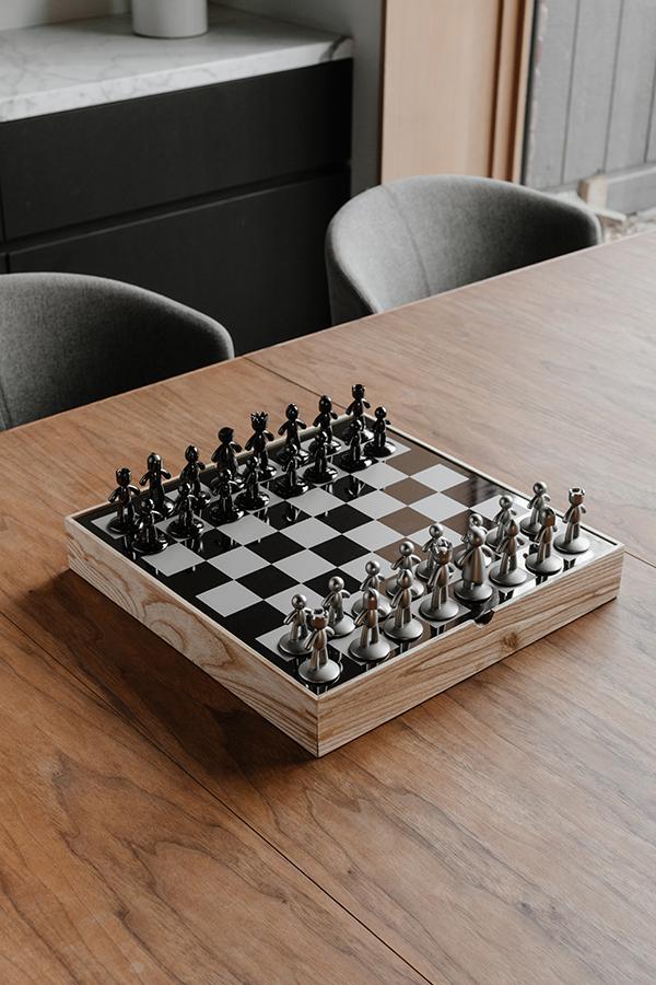 Набор из шахматной доски и необычных шахмат в виде культовых человечков Buddy станет отличным подарком и для заядлых шахматистов, и для тех, кто просто любит красивые необычные вещи. Шахматные фигуры выполенены из металла с никелевым и титановым покрытиями и бархатными накладками на основании, которые защищают поле от царпапин. Металлическое шахматное поле заключено в деревянную коробку из натурального ясеня, которая также служит местом для хранения шахматных фигур.