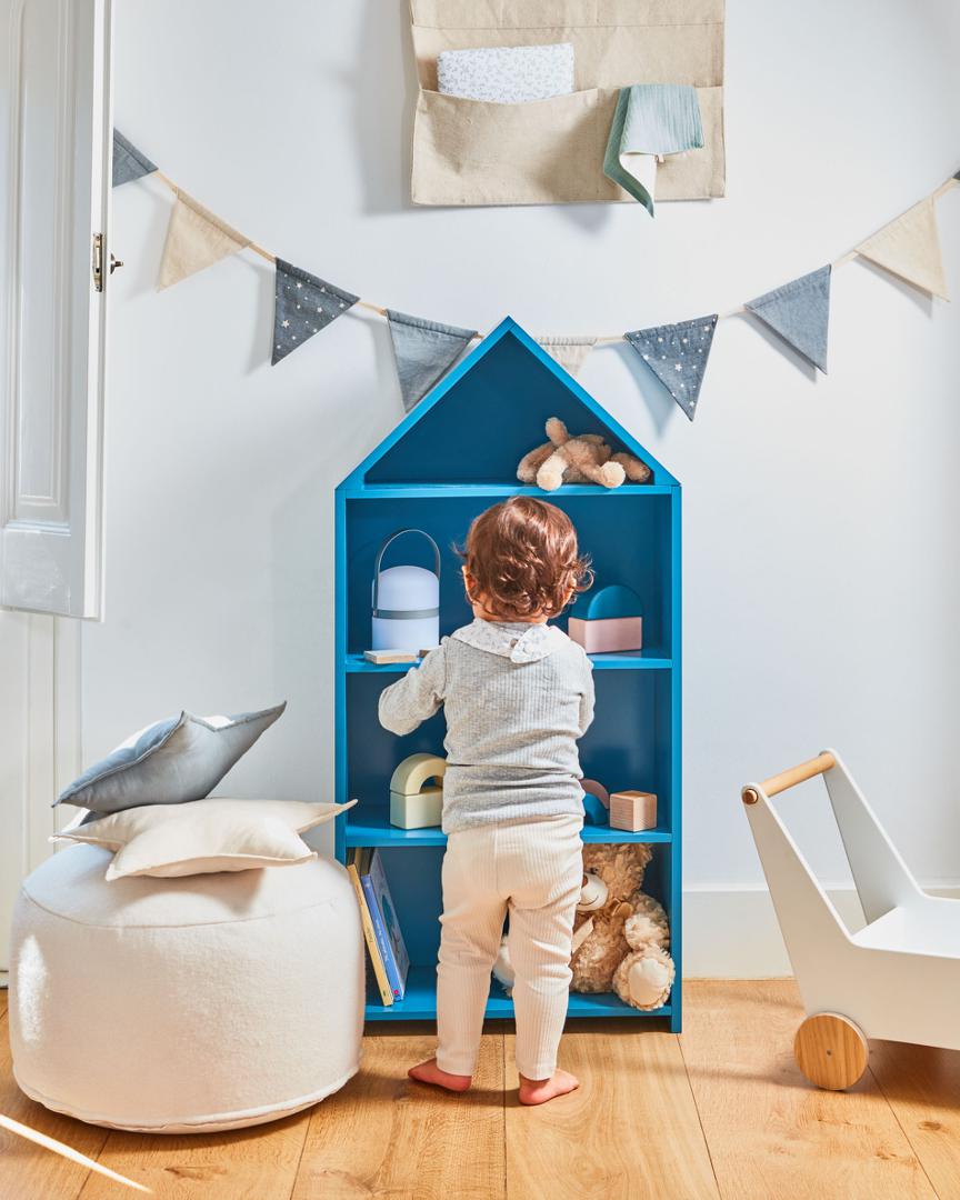 Стеллаж из МДФ, покрытый синим лаком. Краска на водной основе - подходит для самых маленьких.