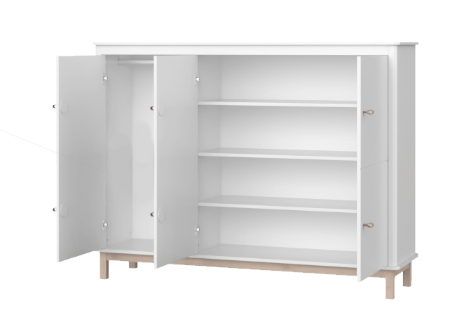 Низкий шкаф classic визуально не загромождает пространство комнаты, но при этом он очень вместительный. Благодаря невысокому расположению полок и вешалки для одежды, ребенку будет удобно им пользоваться самостоятельно. Материал: массив бука/мдф. Ручки из натурально кожи.