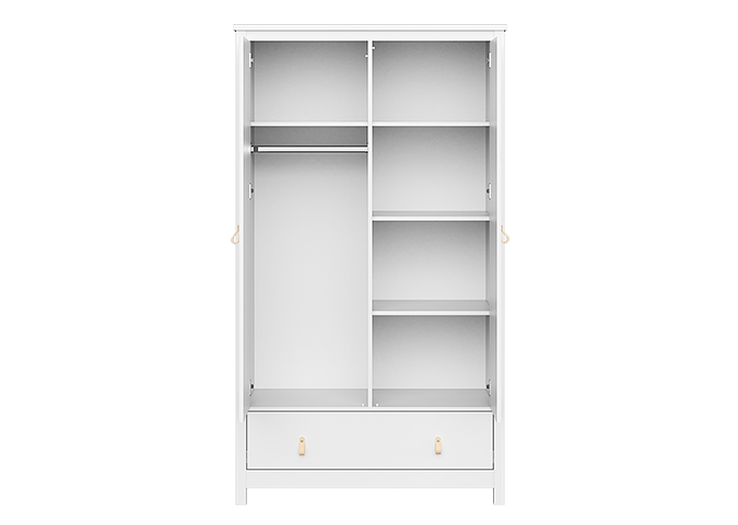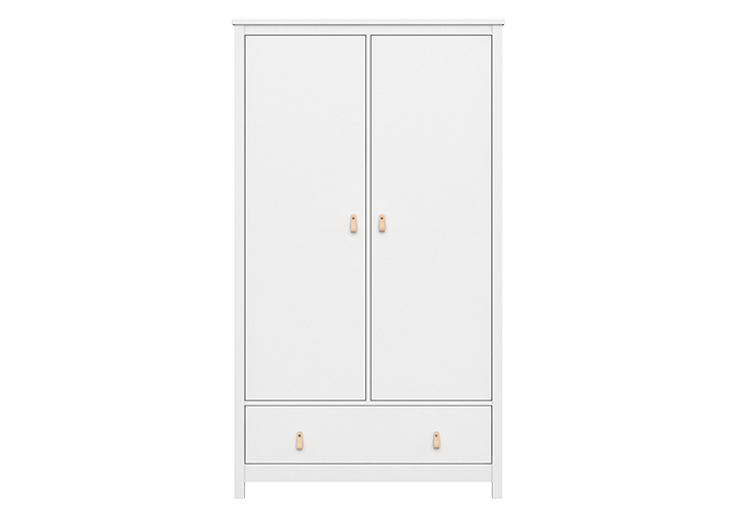 Двухстворчатый шкаф wood имеет два отделения с полками и штангой. Нижний ящик на бесшумных направляющих с доводчиками. Ручки на дверцах и выдвижном ящике выполнены в виде петель из натуральной кожи. Каркас шкафа сделан из массива бука, что обеспечивает устойчивость и долговечность конструкции. Плоскости из МДФ.