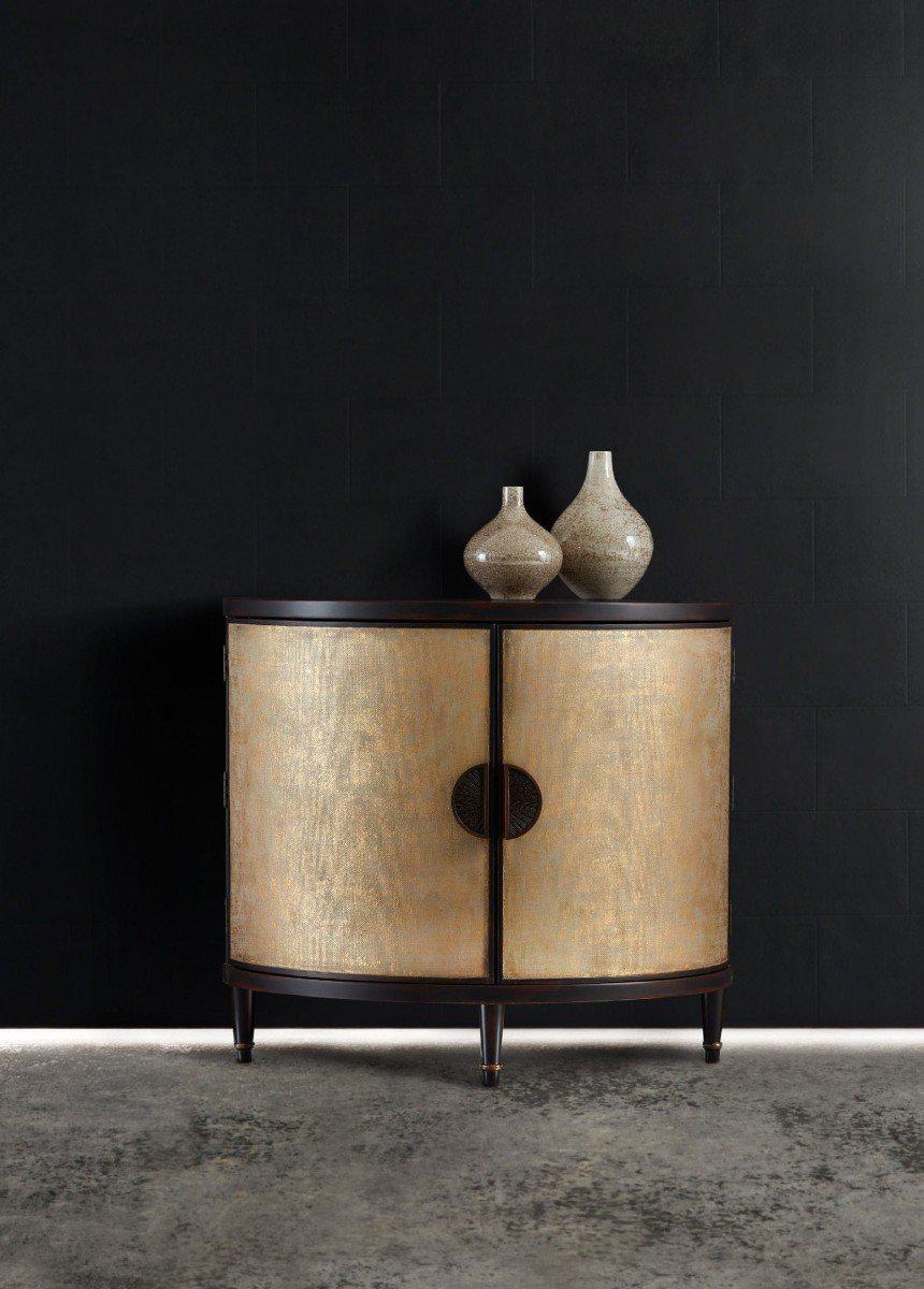 Очень интересный вариант акцентного комода для гостиной. Комод выполнен в переходном стиле. Изготовлен из тополя, твердых пород дерева и кленового шпона, украшен золотистой металлической рафией. Комод выглядит изысканно и стильно, он непременно станет главным украшением вашей гостиной. Прекрасный выбор для тех, кто ищет интересные акцентные решения.