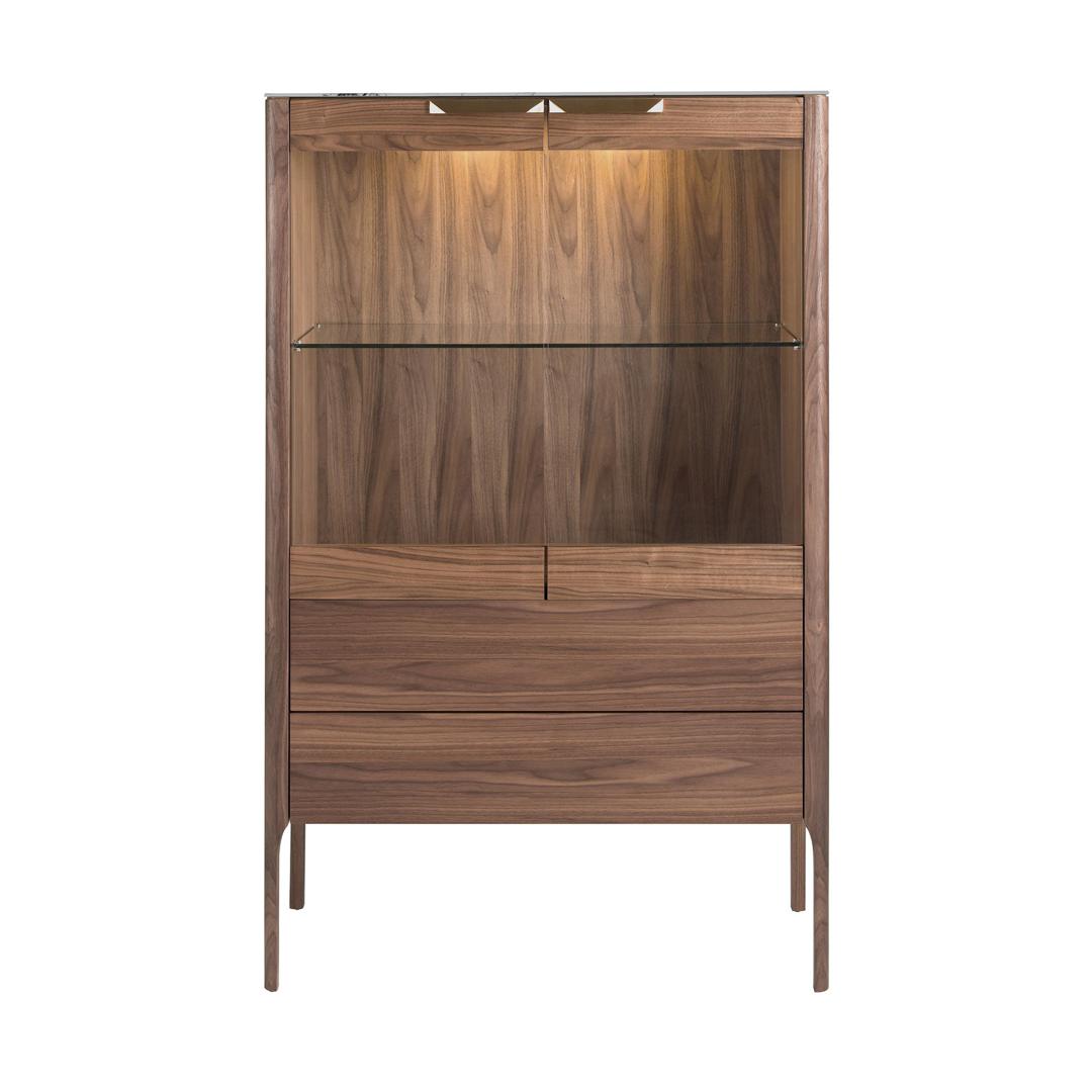 Буфет CP1806-F — элегантный дизайн в современном исполнении от фабрики Angel Cerda. Буфет очаровывает с первого взгляда. Продуманная эргономика, изящные плавные очертания, безупречное ореховое дерево — все это признаки роскошной современной мебели, над созданием которой работала целая команда дизайнеров. Данная модель — это воплощение европейского модерна, но с сохранением лучших традиций. Буфет визуально поделен на две половины. Вверху — одно большое отделение с полкой, а ниже — два одинаковых выдвижных ящика. Верхнее отделение закрывается двустворчатой дверью. Она выполнена из ударопрочного стекла черного матового цвета. У дверей предусмотрены ручки. Поверх стекол закреплены деревянные панели. Они не только служат декоративным элементом, но и улучшают эксплуатационные характеристики изделия (снижают вибрацию стекол). Ящики без ручек, оснащены доводчиками. Они изготовлены (как и каркас) из МДФ и шпона орехового дерева. Этот материал популярен в европейских интерьерах, так как легко сочетается с любыми цветовыми решениями. Буфет опирается на четыре ножки из натурального массива. Они являются частью боковых граней каркаса, поэтому конструкция цельная, а значит, надежная и прочная. Размеры буфета: ширина — 99 см, высота — 161 см, глубина — 40 см. Потребуется сборка. Инструкция и крепеж входят в комплектацию.