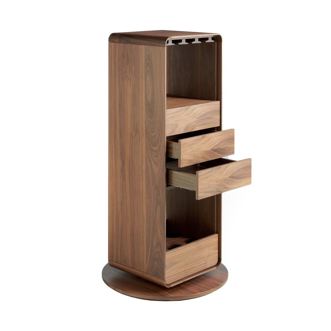 Вращающийся на 360º круглый барный блок из шпонированного орехом дерева с 3 боковыми ящиками. Имеет верхние планки из массива ясеня с подставкой для стаканов и нижнее пространство для 6 бутылок.