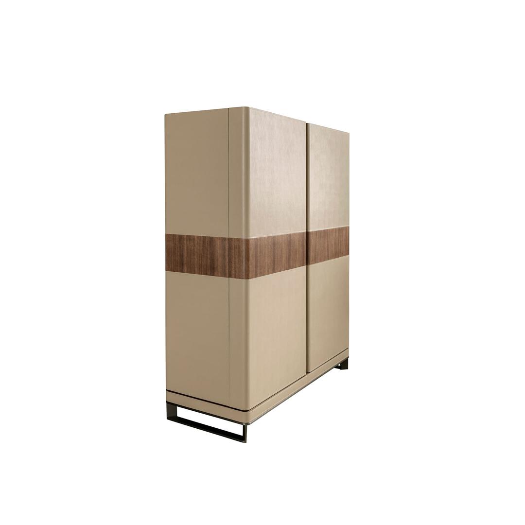 Высокий буфет современного дизайна с натуральной деревянной структурой, шпонированной орехом, обитый кожей цвета норки и оригинальными полированными ножками из нержавеющей стали. Имеет большое пространство для хранения с 3 ящиками с системой открывания с помощью язычка и системой плавного закрывания, а также 2 дверцы с системой открывания и закрывания с помощью язычка.