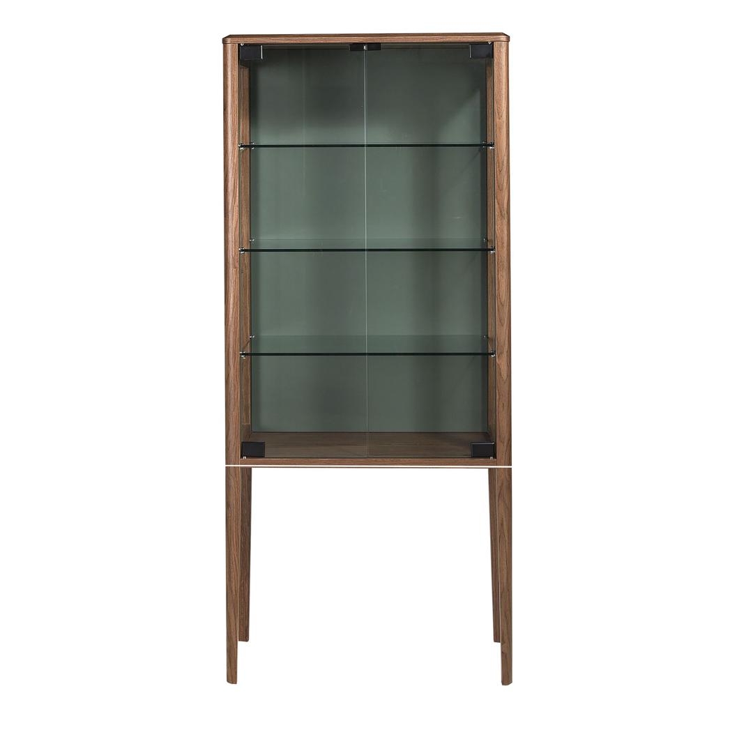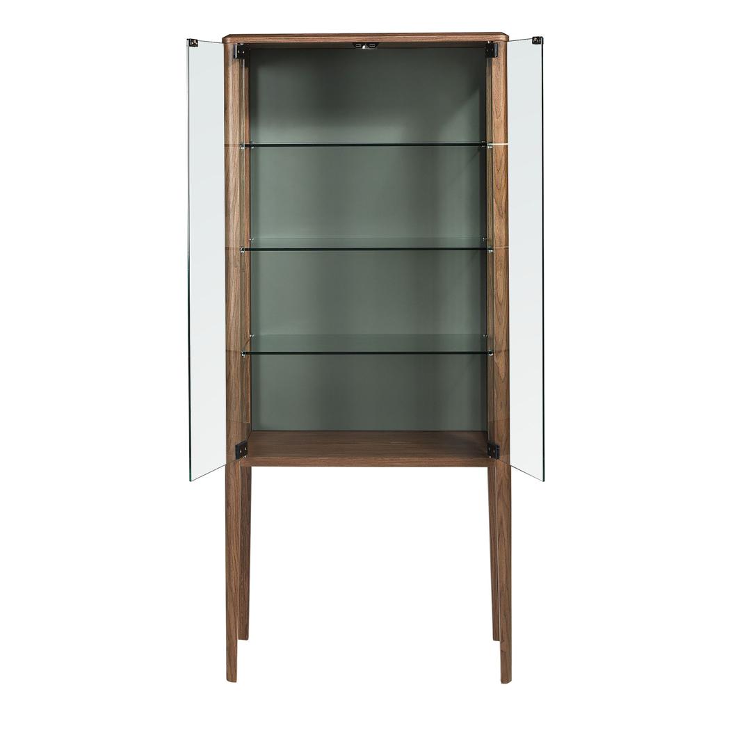 Современный высокий буфет, выполненный из натурального орехового шпона и стекла, с оригинальными ножками из натурального орехового шпона. Внутреннее освещение этого высокого буфета позволяет создать теплую и расслабляющую атмосферу, обеспечивая при этом лучший обзор содержимого. Оригинальная деталь из темно-зеленого МДФ идеально дополнит стиль вашей гостиной. Он имеет вместительное пространство для хранения, оснащен двумя дверцами с системой открывания и закрывания «нажать и потянуть».