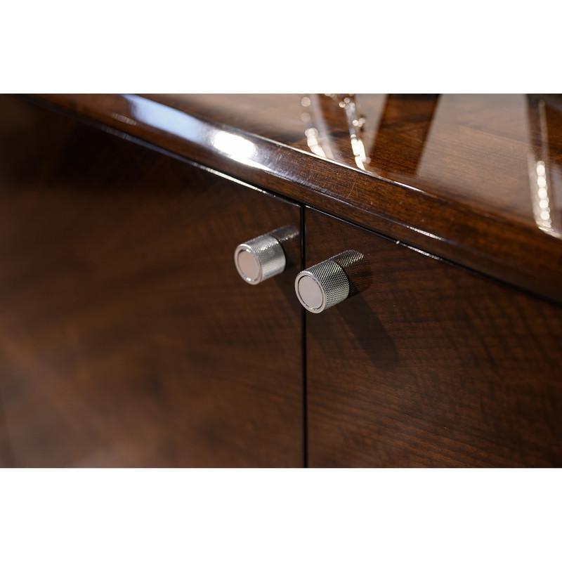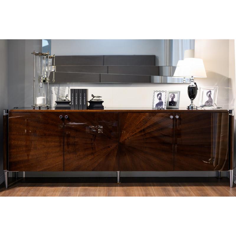 Буфет с четырьмя распашными двецами выполнен в стиле Ар-деко. Изготовлен из шпонированного МДФ. Столешница из мрамора. Детали выполнены из нержавеющей стали с хромированным покрытием.