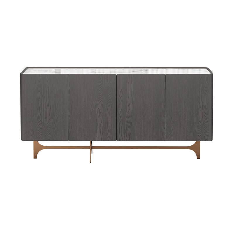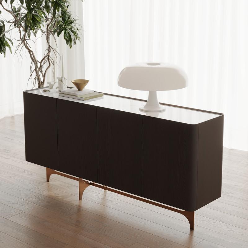 Буфет в современном стиле от бренда Fratelli Barri - это не только стильный элемент интерьера, но и функциональный предмет мебели для современной столовой или гостиной. Буфет изготовлен из высококачественного МДФ высокой плотности. Отделка - натуральный шпон ореха тонированный в цвет горького шоколада. Столешница - глянцевая керамика с прожилками в серых тонах. Ножки - нержавеющая сталь в цвете латунь. Буфет оснащен четырьмя дверцами, что позволяет организовать удобное хранение вещей, при этом не создавая визуального шума. Буфет относится к коллекции Terni и отлично будет сочетаться с другими предметами коллекции.