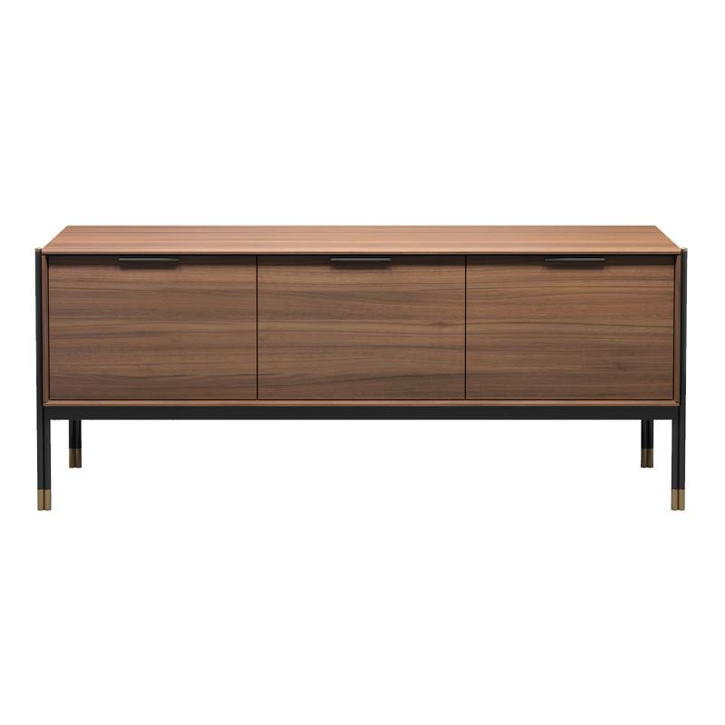 Буфет на высоких ножках от бренда Mod Interiors. Легкая структура из металла и корпус в натуральном дереве делает этот предмет мебели универсальным для различных стилей интерьера. Также мебель данной коллекции прекрасно подойдет в интерьер в стиле loft. Черный металл отлично впишется в пространство в природной цветовой гамме с черными или серыми акцентами. Корпус и фасады буфета выполнены из высококачественного МДФ. Отделка - натуральный шпон американского ореха. Основание - нержавеющая сталь в черном матовом лаке. Металлические ножки в черном матовом лаке, детали в цвете латунь. Металлические ручки в черном матовом лаке. Внутренняя отделка - ламинат. У буфета 3 распашные дверки, за каждой из которых расположена полка. Левая секция - 2 дверки, правая - одна.